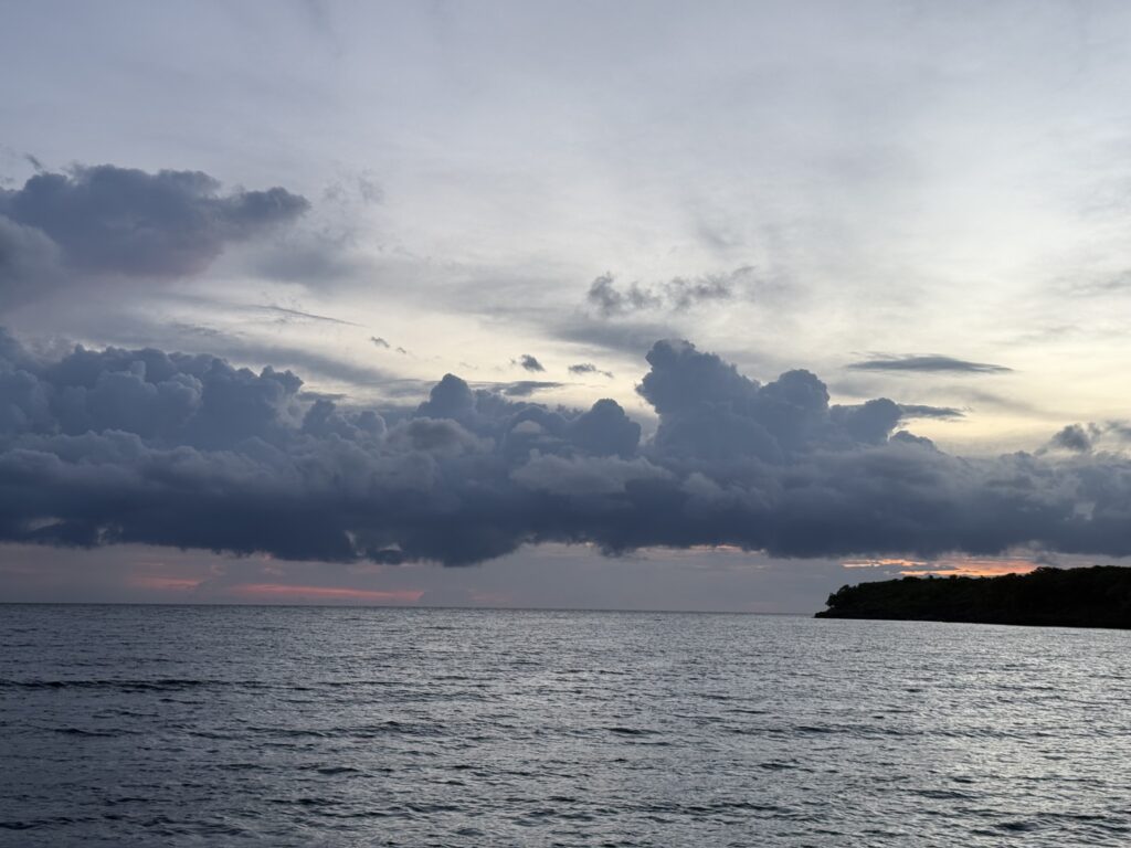 Rowan is in a dilemma about our route tomorrow, it is 70 miles, with the wind angle we still need to head a little further west before turning south. It is a full day and our destination is in some atolls, which we really need good light to get into. If we get there in the dark we will have to try and hove to in fairly strong winds which might be a little too exciting for me. Heaving to is setting the sails so the jib wants to sail one way while the main wants to sail another so, with some rudder adjustment, the boat stands nearly still. The area is full of FADS. I’m crossing everything we get there in daylight!