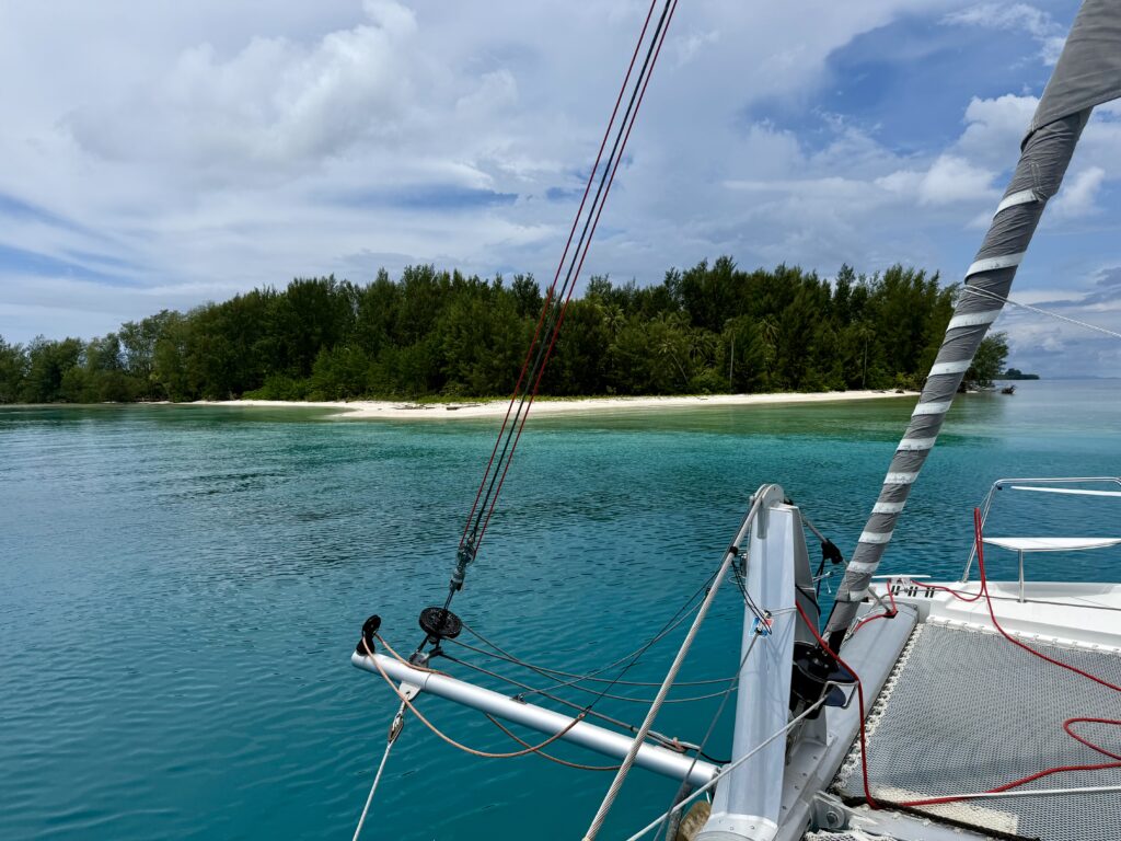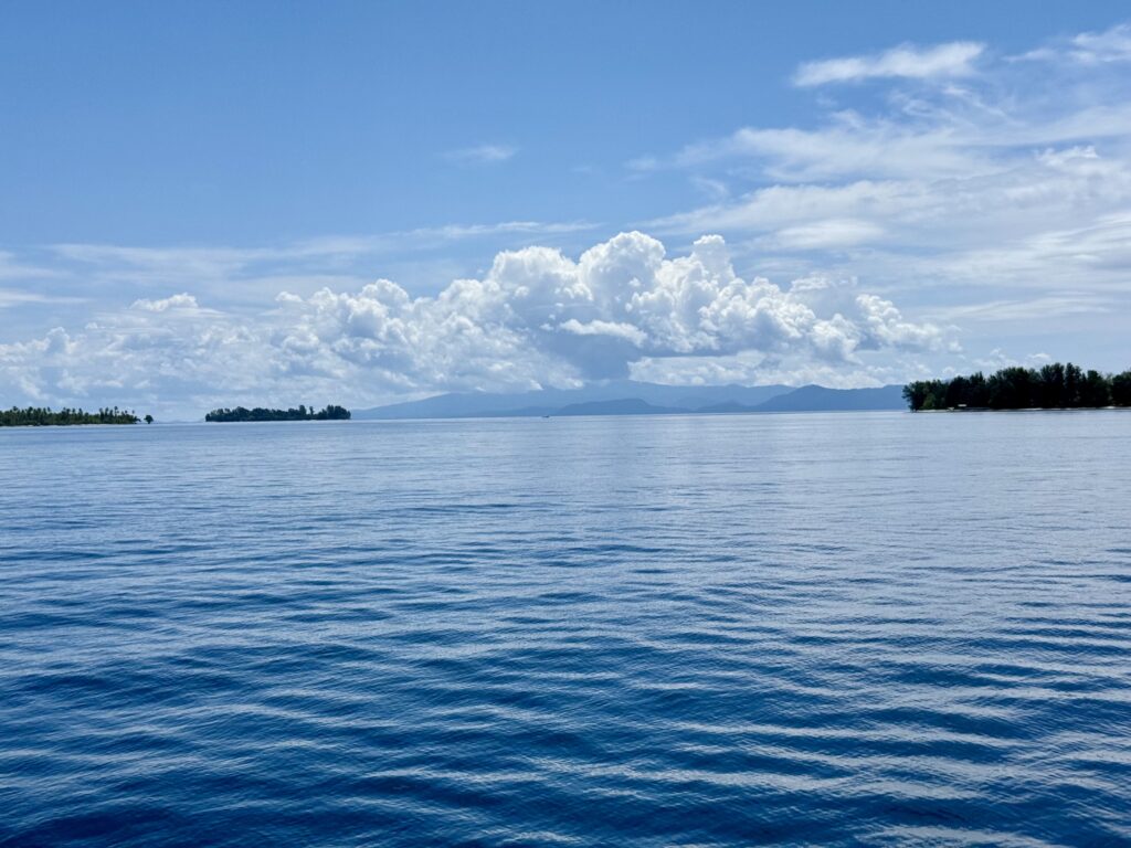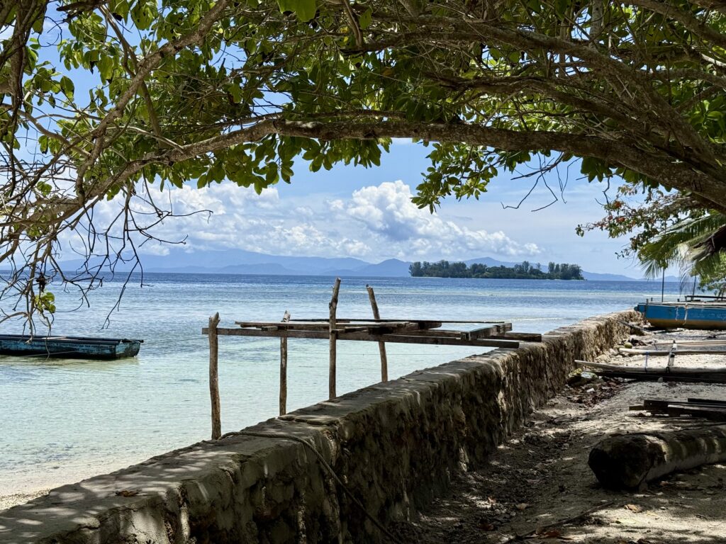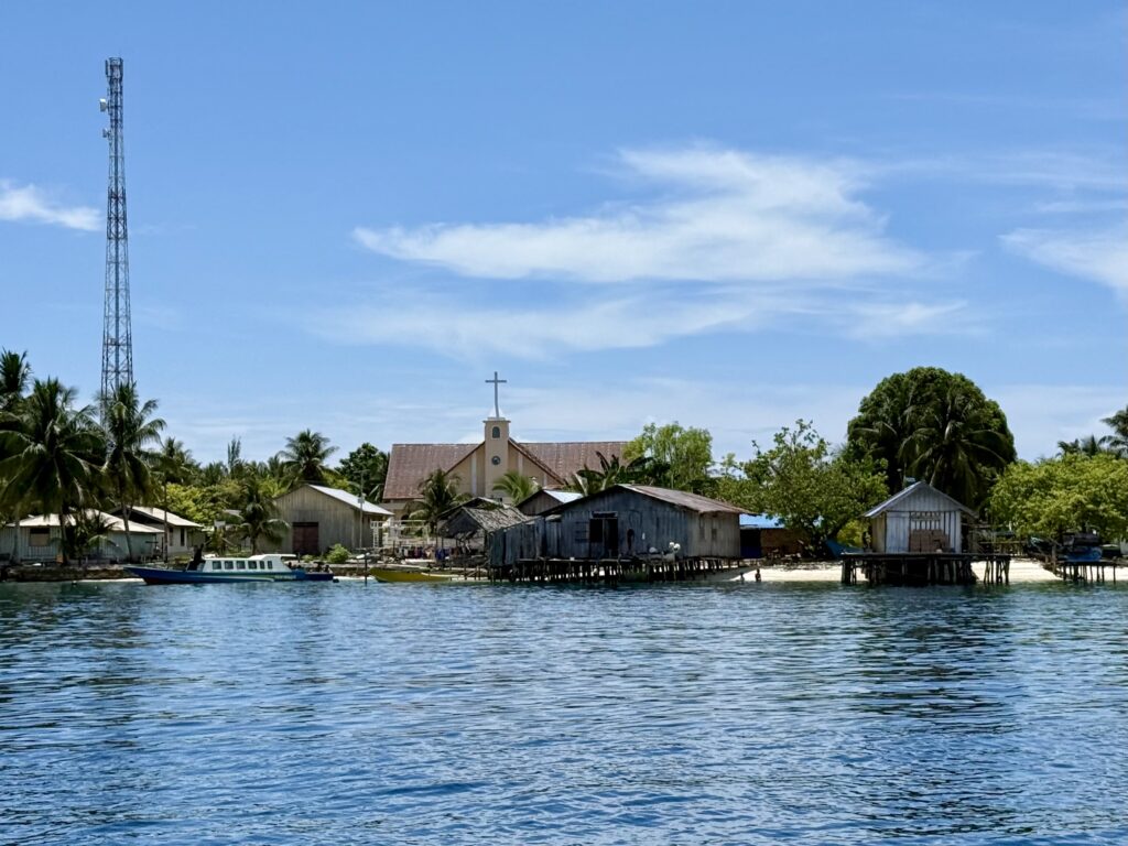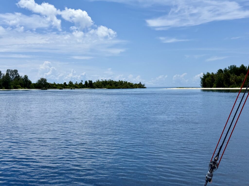 Our fresh food is running quite low and we won’t be back in a town until we pick Clinton up in Sorong, so eating out is a happy option. Plus our guide yesterday said there was a little village we could buy provisions from, so we went about 3 miles around the corner in search of both provisions and food. The anchorage was in a narrowish channel between two islands, the tide was roaring through it, swirling PolePole about. We got the anchor down in a nice sandy patch which was shallow, we needed a good holding in this turbulent water.