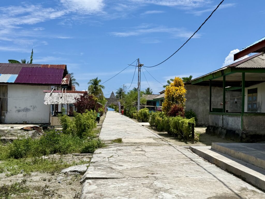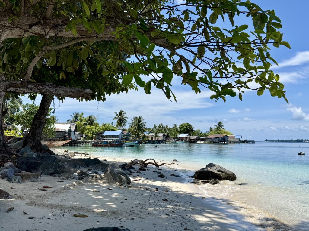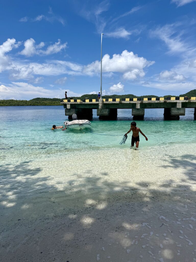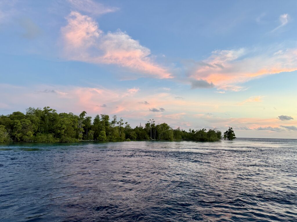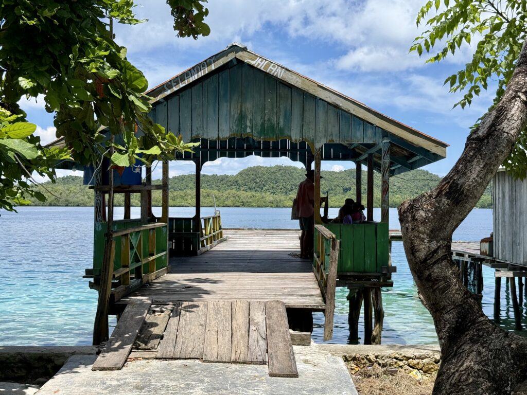 Our fresh food is running quite low and we won’t be back in a town until we pick Clinton up in Sorong, so eating out is a happy option. Plus our guide yesterday said there was a little village we could buy provisions from, so we went about 3 miles around the corner in search of both provisions and food. The anchorage was in a narrowish channel between two islands, the tide was roaring through it, swirling PolePole about. We got the anchor down in a nice sandy patch which was shallow, we needed a good holding in this turbulent water.