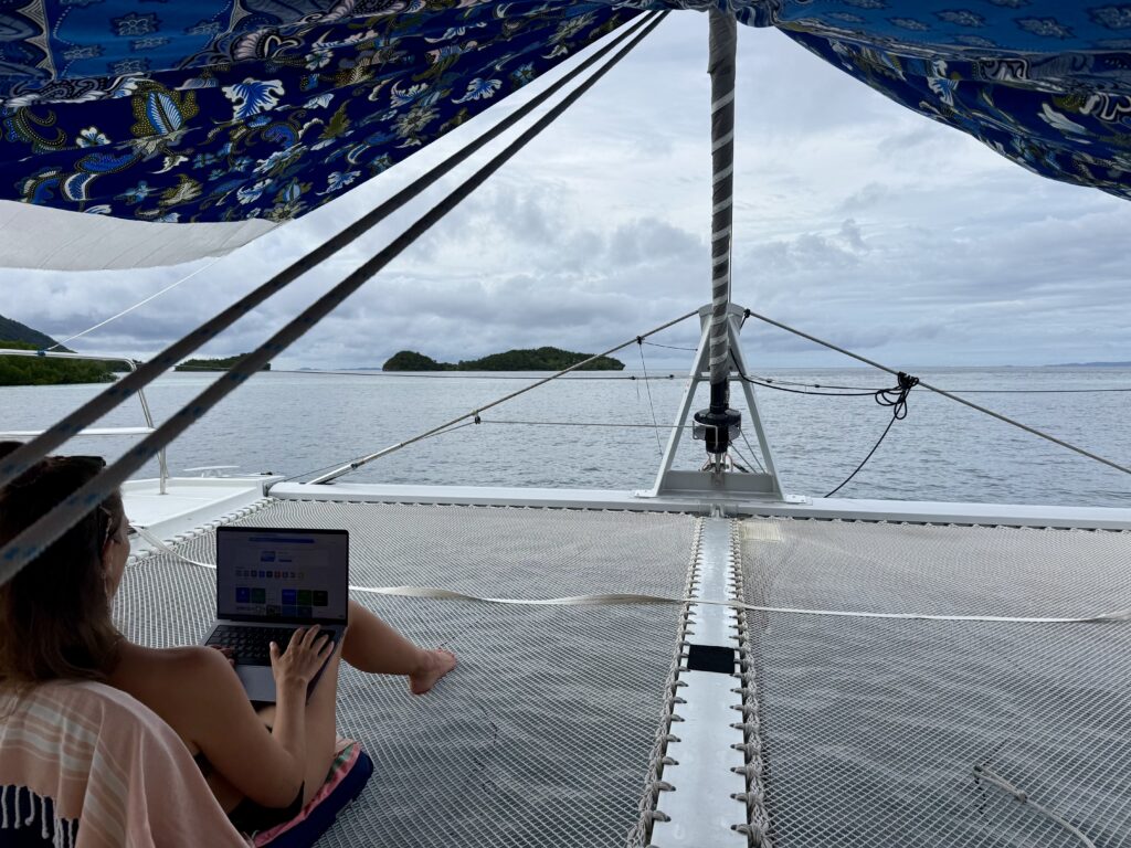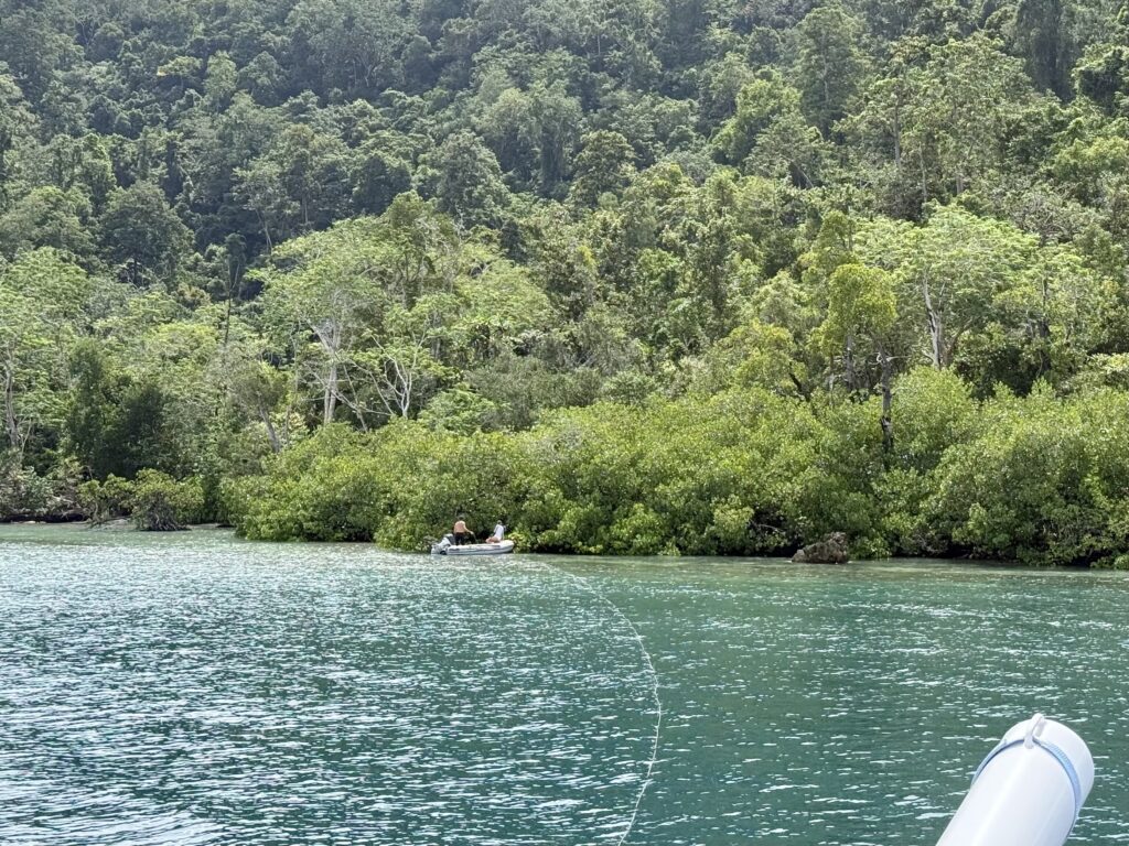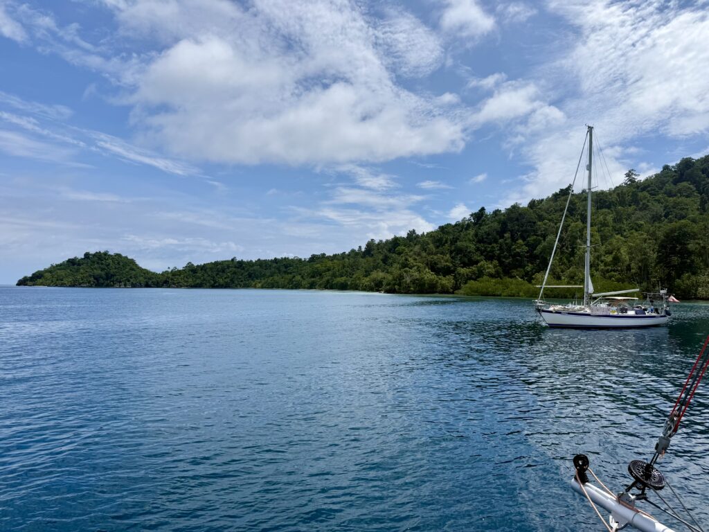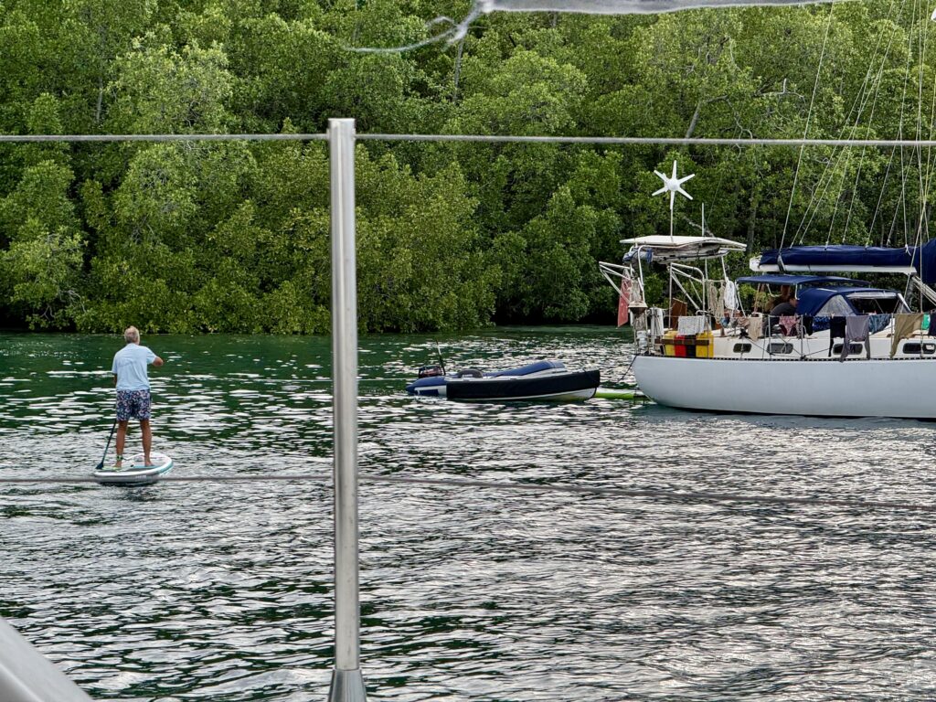 Dani went for a second dive in the afternoon and saw some lovely coral and colourful Nudibranch. It’s a type of slime-oozing sea slug in amazing colours and patterns. Dani had a great time diving and looking at them close up as they are pretty small. When he got back he and Phoebs went for a walk on the beach. I was lying beneath the fan! It wasn’t long before a big squall descended, it seemed like our anchor was dragging, as we were getting very close to the reef, so I had to get up and help Rowan get us forward. Phoebs and Dani returned in very choppy water, my goodness the state of the sea can turn so quickly. When the squall had passed we picked up the anchor chain and moved us forward a bit. Plus we had to retie our stern line as it was rubbing against a bit of rock. Never a dull moment. That finished off the evening for us. Rowan had invited the two boats to join us for drinks but Phoebs and I were not up for it. The drinks relocated on another boat, Rowan paddle boarded over with his beers to join the Aussies and had a very jolly time. We had not even noticed Banana Split leave the anchorage in the morning.