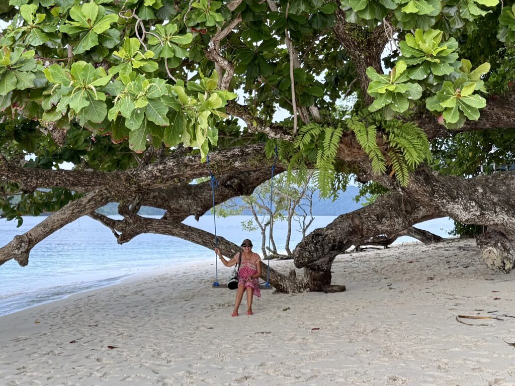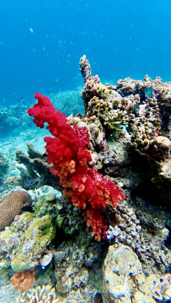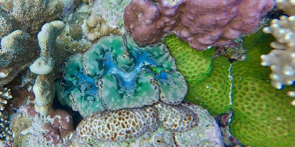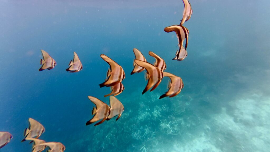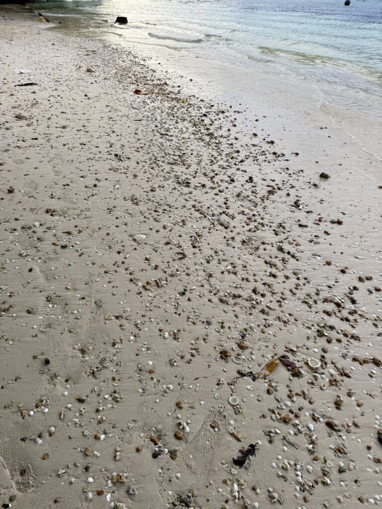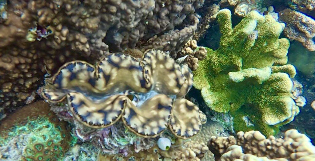 In the morning we went for a really long snorkel, covering some of the distance we did yesterday. It is a very pretty stretch of colourful coral, with loads of very colourful clams too. There were quite a few anemones with different Clown fish in them, one was a very large cheeky orange fish, that was bravely coming out to see what the camera was. Another anemone had small little light orange Clown fish with a single white stripe running down its spine, I can’t remember seeing these before. The current was roaring through as long as you don’t want to swim against it, you just drift along without even using your flippers.