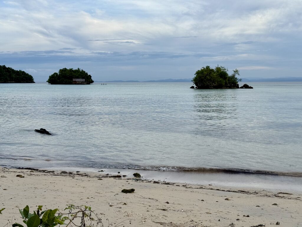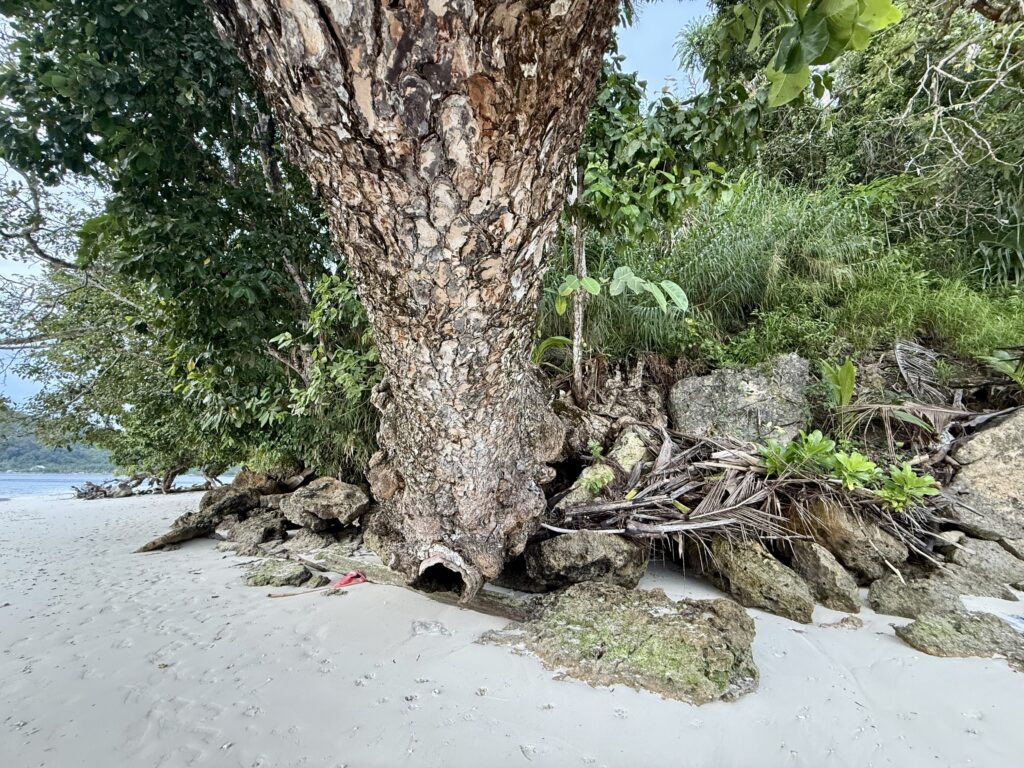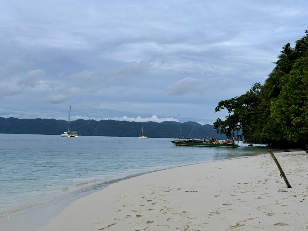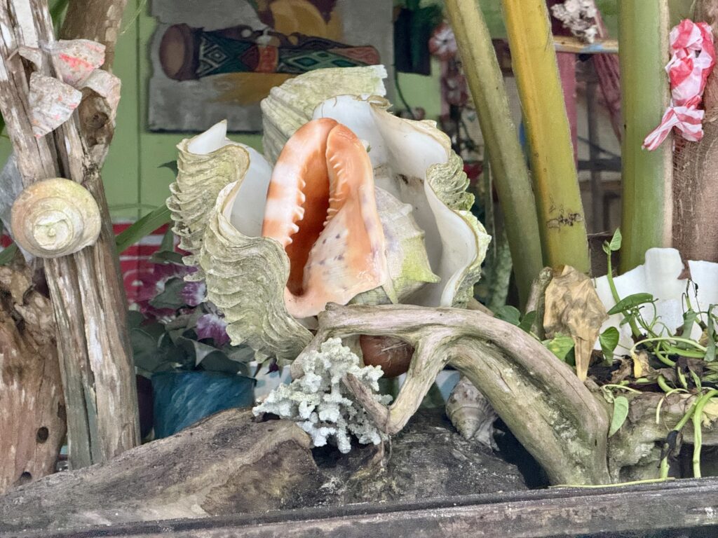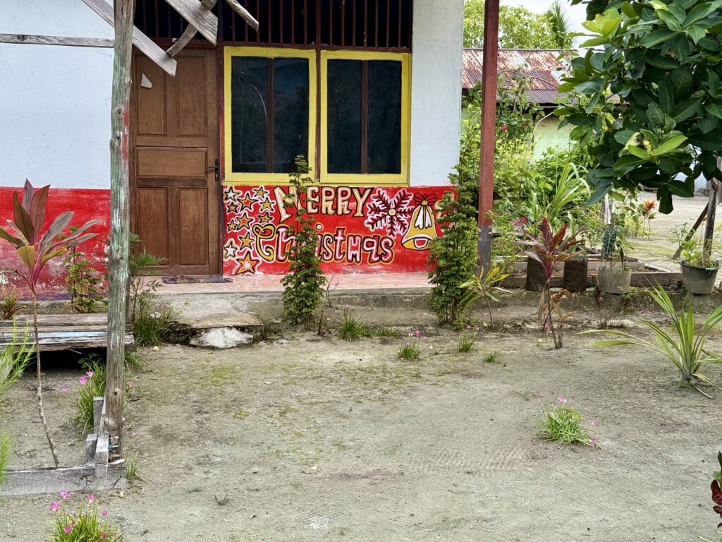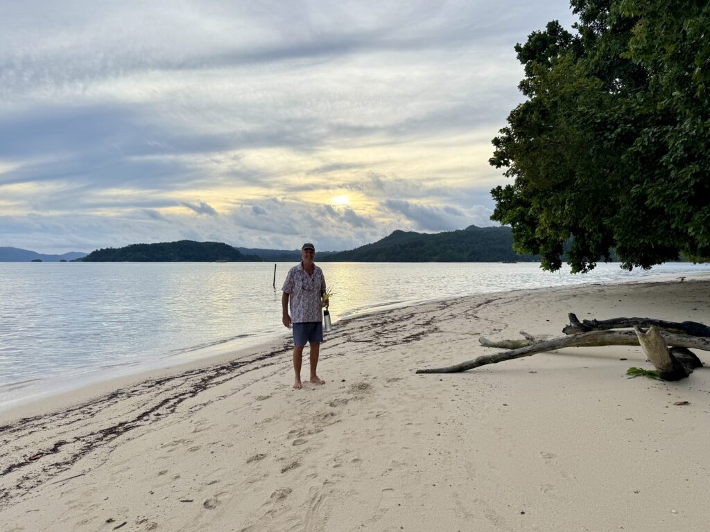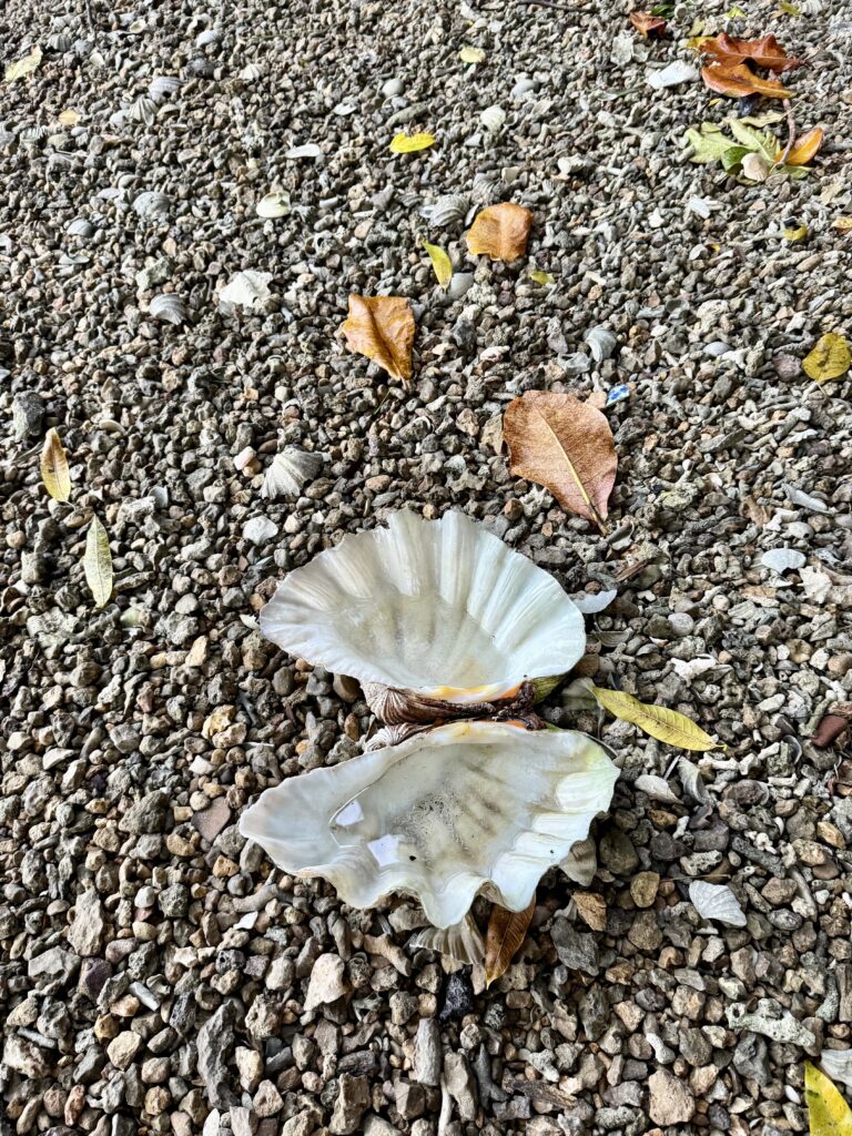 Later in the afternoon we went for a walk in the village. We need to make space in our guest cabins with the kids imminent arrival. We decided to give all our presents (knives, soap, tongs, glasses, clothing, shoes, old backpack) and tinned food to the village. It made up 3 big bags. It is a very pretty little village all decorated for the dignitaries that came on Monday, we still have not worked out who it was, could have been something to do with the church. The chief is away and the school was closed for the holidays, we eventually found two very friendly helpful young girls at a house. They had loads of little aloe vera plants that they were growing in plastic bags, i asked if I could buy one and they insisted I could just have it. We thought they were the right kind of people to share all the goodies with the village, they loved my old bras! We had a good walk around the tiny island and back to the jetty along the lovely soft white sand beach which was full of amazing shells.