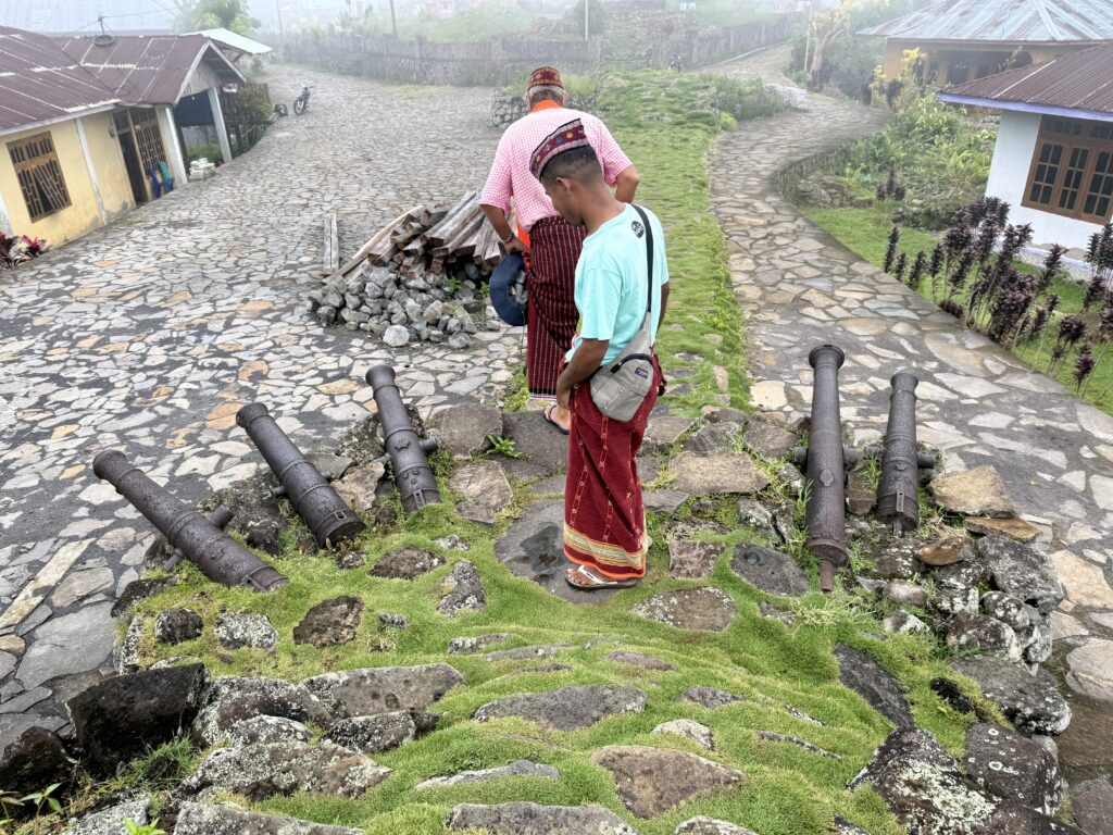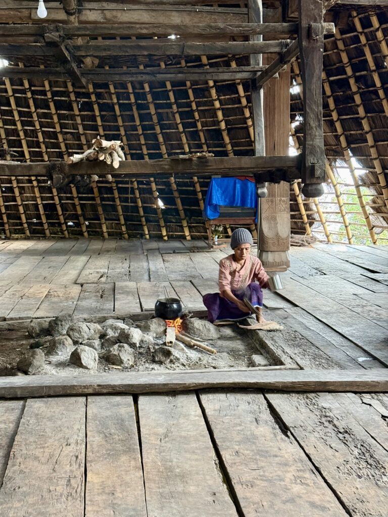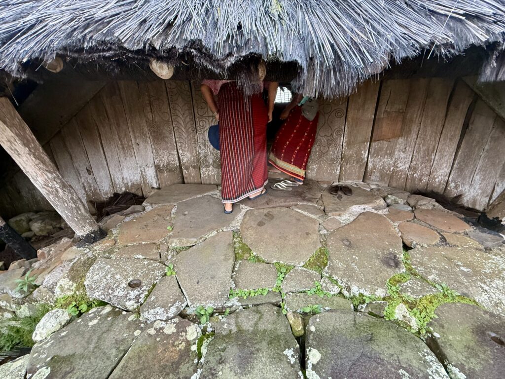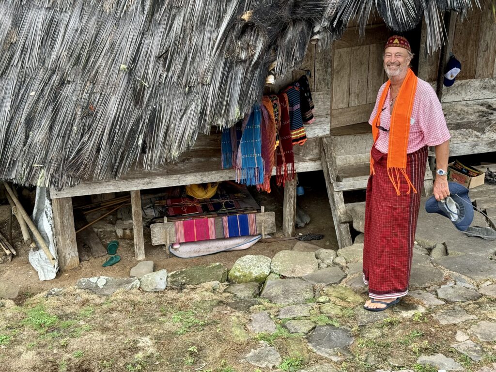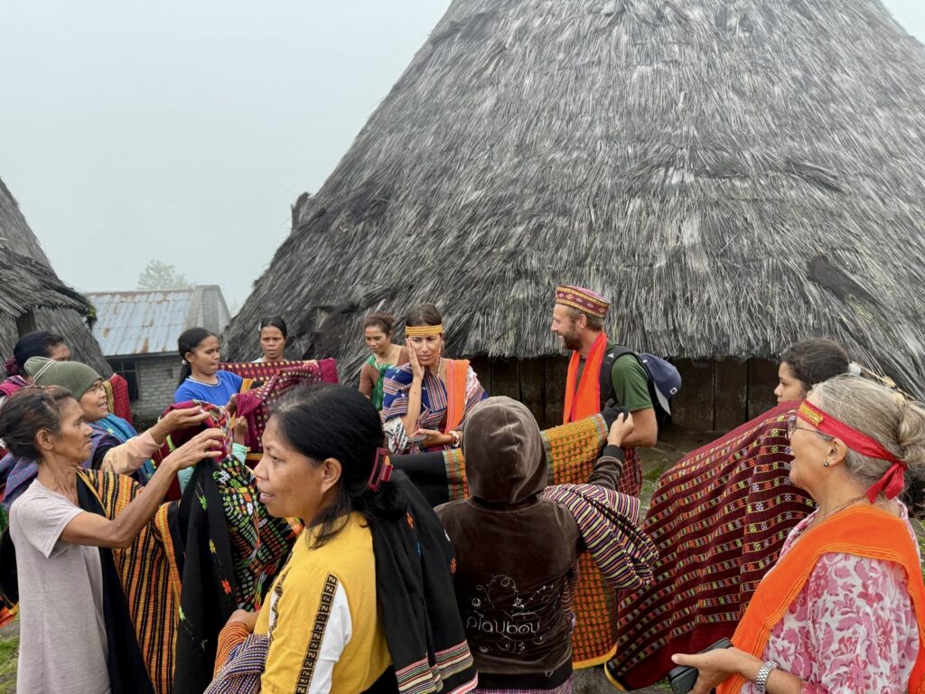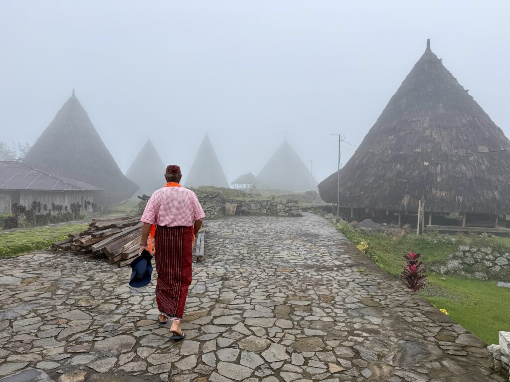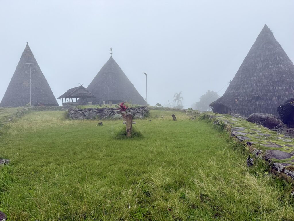 Our first stop was a view of the spiderweb rice fields. Someone has cottoned onto this view which was impressive. The rice fields are laid out like a spiderweb and each section is owned by a different family. Having paid our entrance fee, there was nobody to explain anything and judging from the way Finus asked for directions he had never been there before. Some kids in very smart school uniform took us up the hill to the view point and gave us a little information with their school english. We got here just after 1pm and our hearts sank when he said it was still another couple of hours to the next site an ancient traditional village. We happily bounced back along the road we had just come from for another hour and then took a tiny fork left winding steeply along for another 40 minute. Passing vehicles coming the other way was an incredibly skilful manoeuvre, just brushing wing mirrors. We finally made it up to the Todo village having descended into a deep valley and up the other side. The first thing we passed was an enormous cathedral, Finus told us everyone here is Catholic, no Muslims live up here, which made sense as we saw our last Mosque at the coast. This village belonged to an old kingdom, we could not get much information out of our guide but at least a couple of hundred years old. The houses are cone shaped and built around a ceremonial sacrifice stone altar, just for animals! The walled area around was used for gladiator style spectator sports. It was very atmospheric as we were in thick mist, apparently on a clear day you can see the coast. To go into the historic area we all had to dress in their floor length traditional dress, thankfully up here in the mountains it was lovely and cool so the thick woven sarong was bearable. We did a little ceremony with the chief which was just like Sevusevu in Fiji. We had to tell him where we were from, he was obviously very taken with Brazil (where Daiana is originally from) as we kept hearing the word during his welcome. We were given hot drinks, the coffee was very good, we had seen coffee growing along the roadside. The main house is used for ceremonial functions and a few of the other traditional houses are lived in. The ladies brought out all their weaving fabrics for us to buy, beautifully done but with modern (most probably Chinese) thread.