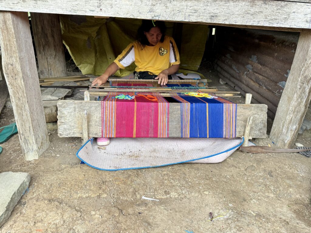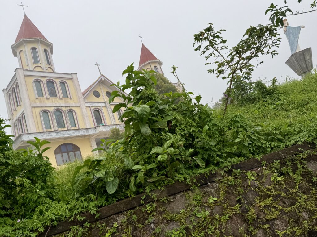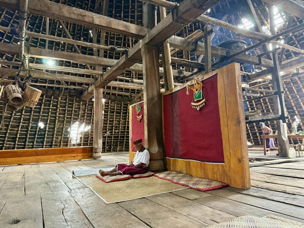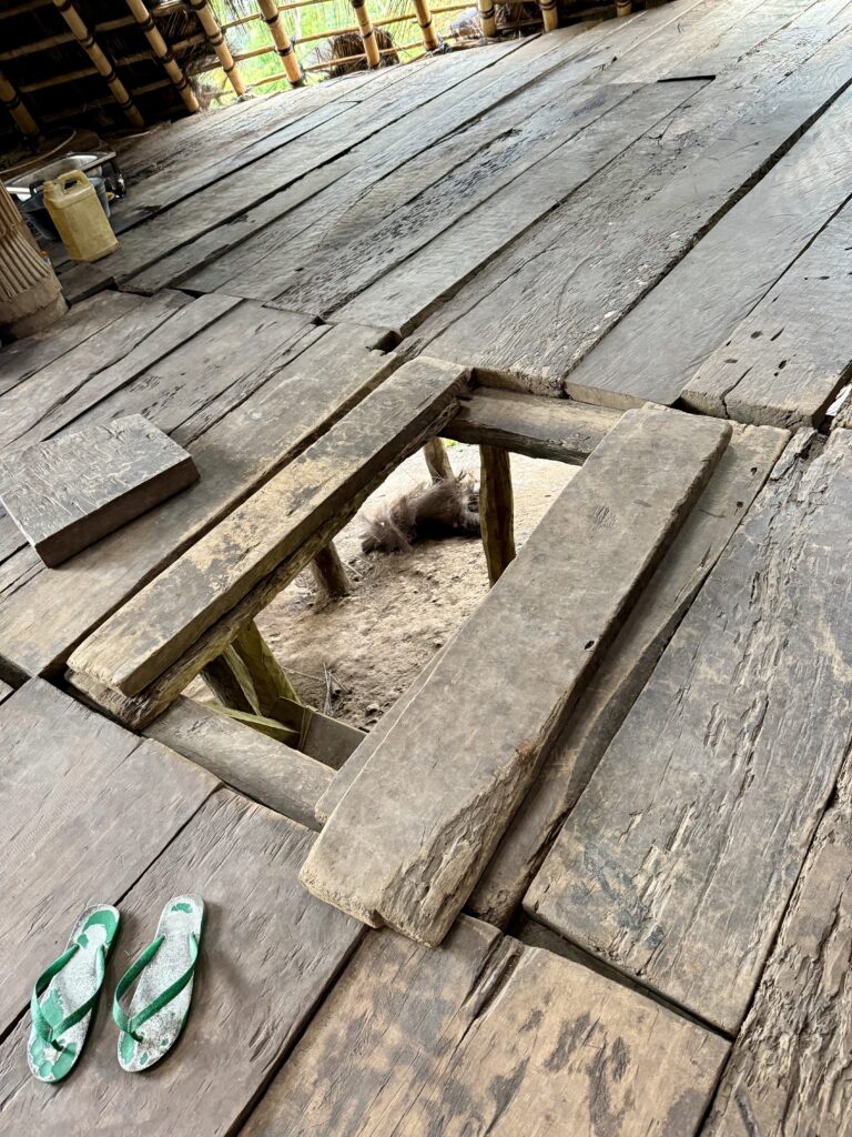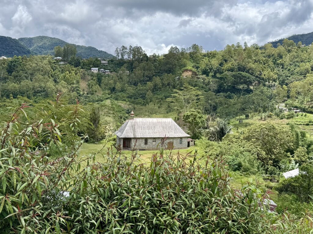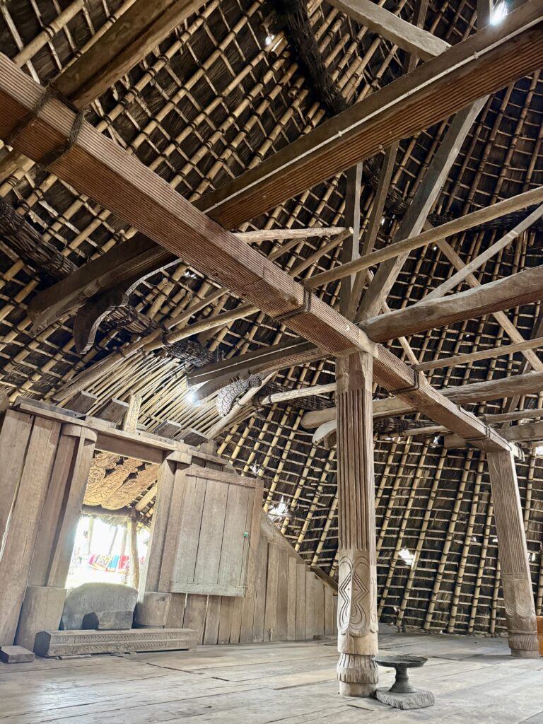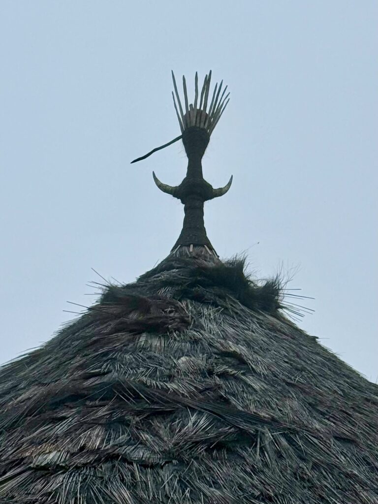 Our first stop was a view of the spiderweb rice fields. Someone has cottoned onto this view which was impressive. The rice fields are laid out like a spiderweb and each section is owned by a different family. Having paid our entrance fee, there was nobody to explain anything and judging from the way Finus asked for directions he had never been there before. Some kids in very smart school uniform took us up the hill to the view point and gave us a little information with their school english. We got here just after 1pm and our hearts sank when he said it was still another couple of hours to the next site an ancient traditional village. We happily bounced back along the road we had just come from for another hour and then took a tiny fork left winding steeply along for another 40 minute. Passing vehicles coming the other way was an incredibly skilful manoeuvre, just brushing wing mirrors. We finally made it up to the Todo village having descended into a deep valley and up the other side. The first thing we passed was an enormous cathedral, Finus told us everyone here is Catholic, no Muslims live up here, which made sense as we saw our last Mosque at the coast. This village belonged to an old kingdom, we could not get much information out of our guide but at least a couple of hundred years old. The houses are cone shaped and built around a ceremonial sacrifice stone altar, just for animals! The walled area around was used for gladiator style spectator sports. It was very atmospheric as we were in thick mist, apparently on a clear day you can see the coast. To go into the historic area we all had to dress in their floor length traditional dress, thankfully up here in the mountains it was lovely and cool so the thick woven sarong was bearable. We did a little ceremony with the chief which was just like Sevusevu in Fiji. We had to tell him where we were from, he was obviously very taken with Brazil (where Daiana is originally from) as we kept hearing the word during his welcome. We were given hot drinks, the coffee was very good, we had seen coffee growing along the roadside. The main house is used for ceremonial functions and a few of the other traditional houses are lived in. The ladies brought out all their weaving fabrics for us to buy, beautifully done but with modern (most probably Chinese) thread.