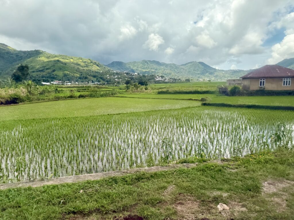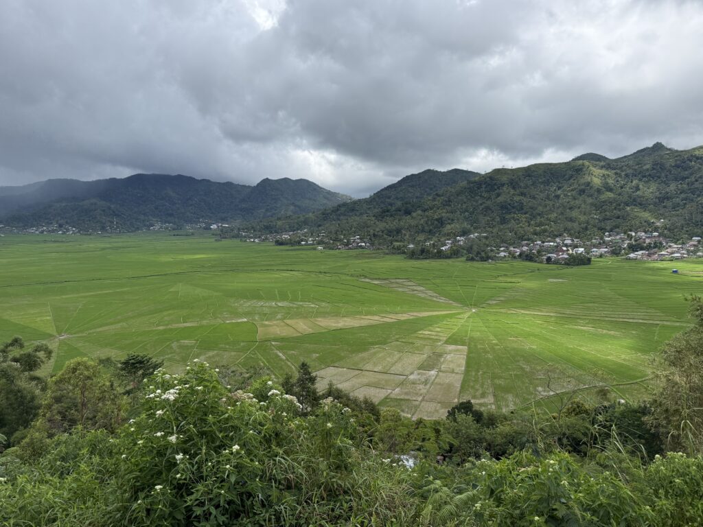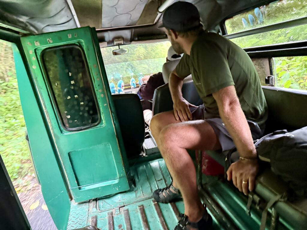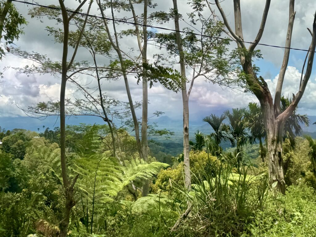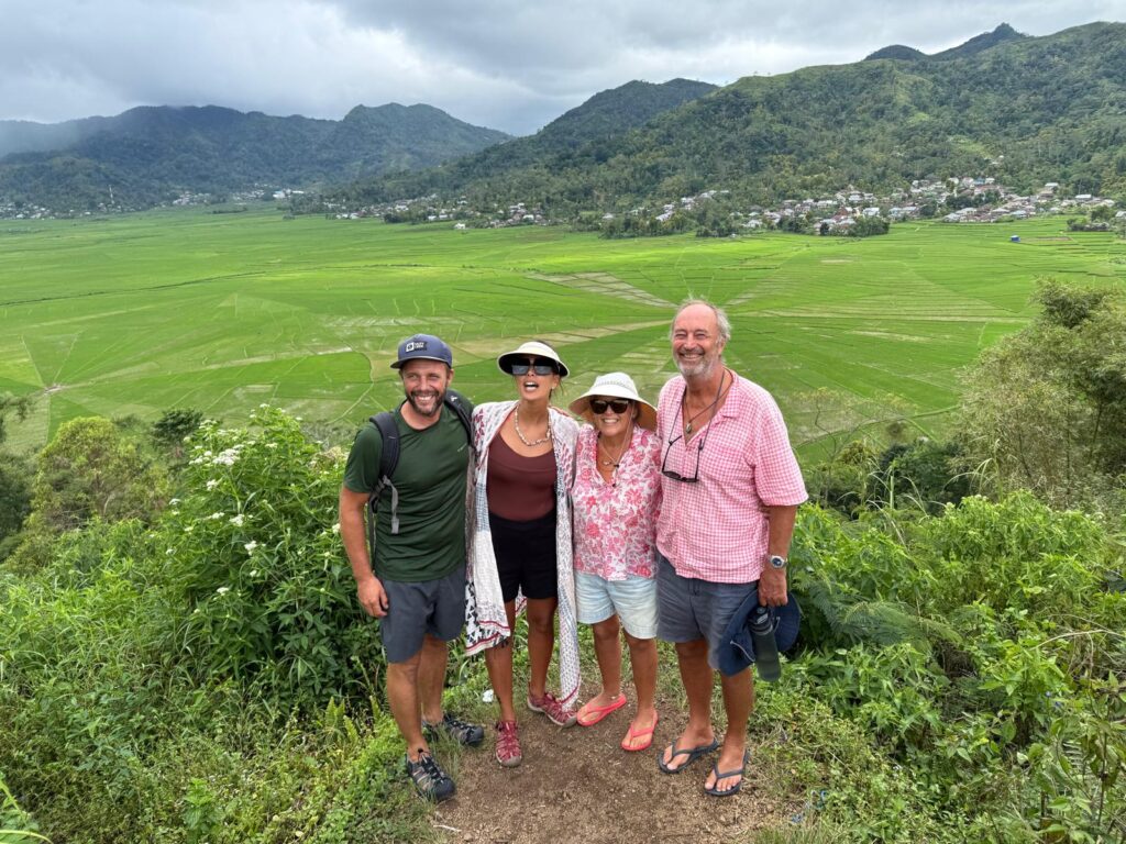 Rowan had been recommended Finus a driver by some other yachts and had arranged with him to take us to a couple of sites in the mountains. Rowan gave him an itinerary that included going to some crazy volcanic lakes, Finus replied saying that would take 5 days! We should have been a hint as to what was coming. We met Finus at 9am, Aaron and Daiana joined us, we clambered into an ancient old mini bus, that had bench seats down the sides and a door on the side that was permanently open. We soon left LBJ and started climbing up the mountain, we spent the next 5 hours going up and down amazing mountain passes with hairpin corners, in this ancient old jalopy that we were very concerned would not make the journey. We went through amazing scenery, mainly rice paddy fields in the valleys and loads of villages. It is the main road down the centre of the island, skirting high mountains and volcanoes, the roads were in pretty good condition and with plenty of traffic. Finus did an incredible job of coaxing the old vehicle to overtake even slower vehicles on some pretty blind corners! We were all clutching the hand rails running along the roof. The roof was so low that Rowan and Aaron had to stoop to fit on the benches, not ideal for looking out the window. Rowan eventually sat up front with Finus.