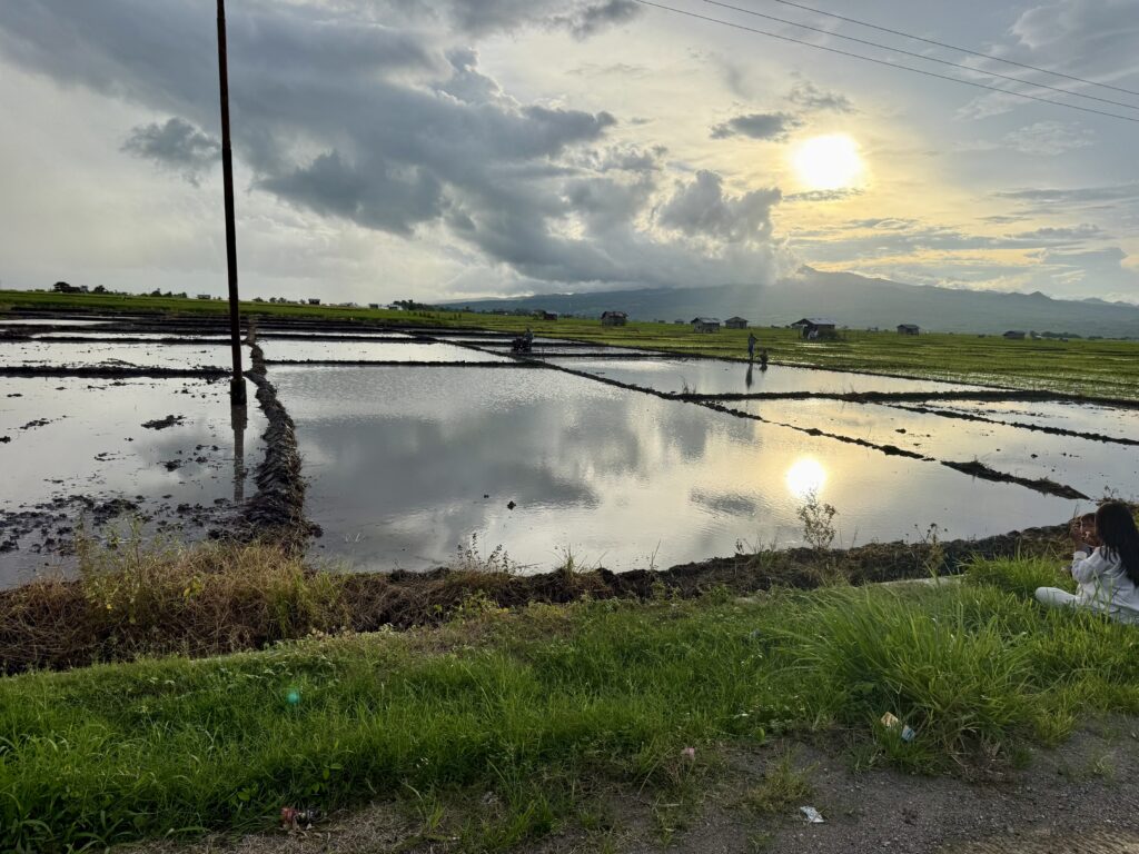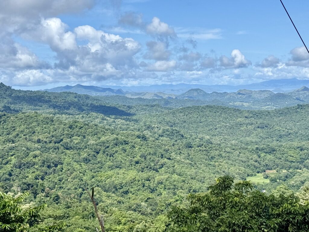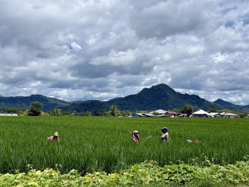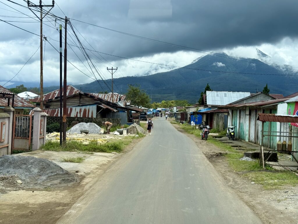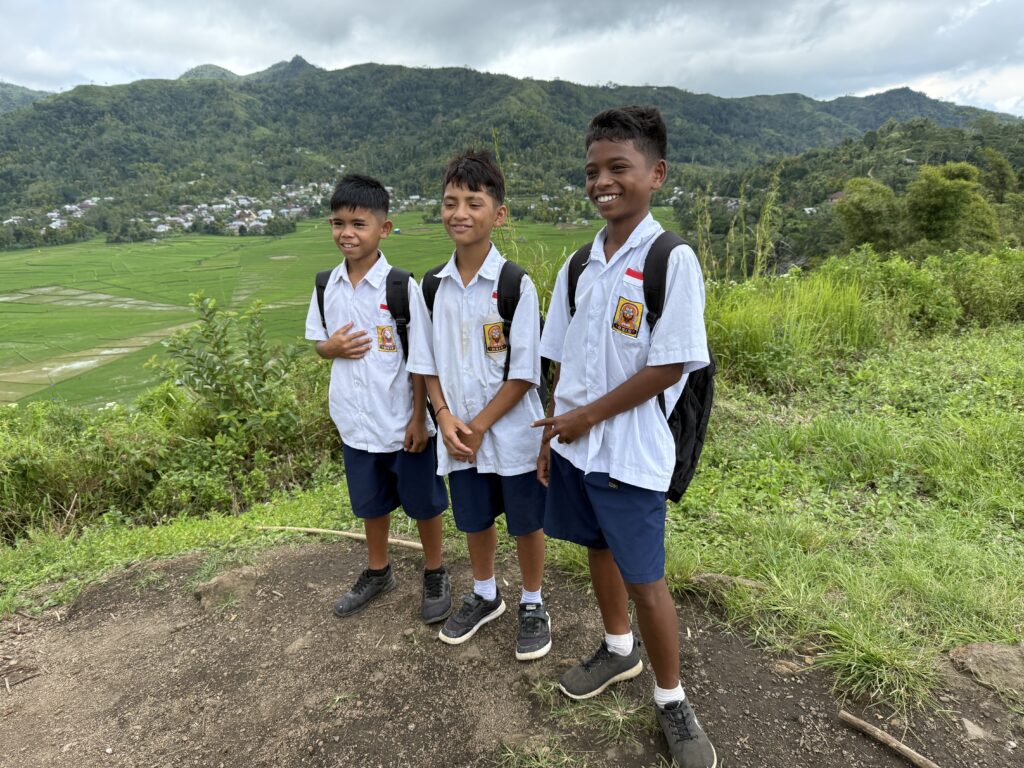 Rowan had been recommended Finus a driver by some other yachts and had arranged with him to take us to a couple of sites in the mountains. Rowan gave him an itinerary that included going to some crazy volcanic lakes, Finus replied saying that would take 5 days! We should have been a hint as to what was coming. We met Finus at 9am, Aaron and Daiana joined us, we clambered into an ancient old mini bus, that had bench seats down the sides and a door on the side that was permanently open. We soon left LBJ and started climbing up the mountain, we spent the next 5 hours going up and down amazing mountain passes with hairpin corners, in this ancient old jalopy that we were very concerned would not make the journey. We went through amazing scenery, mainly rice paddy fields in the valleys and loads of villages. It is the main road down the centre of the island, skirting high mountains and volcanoes, the roads were in pretty good condition and with plenty of traffic. Finus did an incredible job of coaxing the old vehicle to overtake even slower vehicles on some pretty blind corners! We were all clutching the hand rails running along the roof. The roof was so low that Rowan and Aaron had to stoop to fit on the benches, not ideal for looking out the window. Rowan eventually sat up front with Finus.