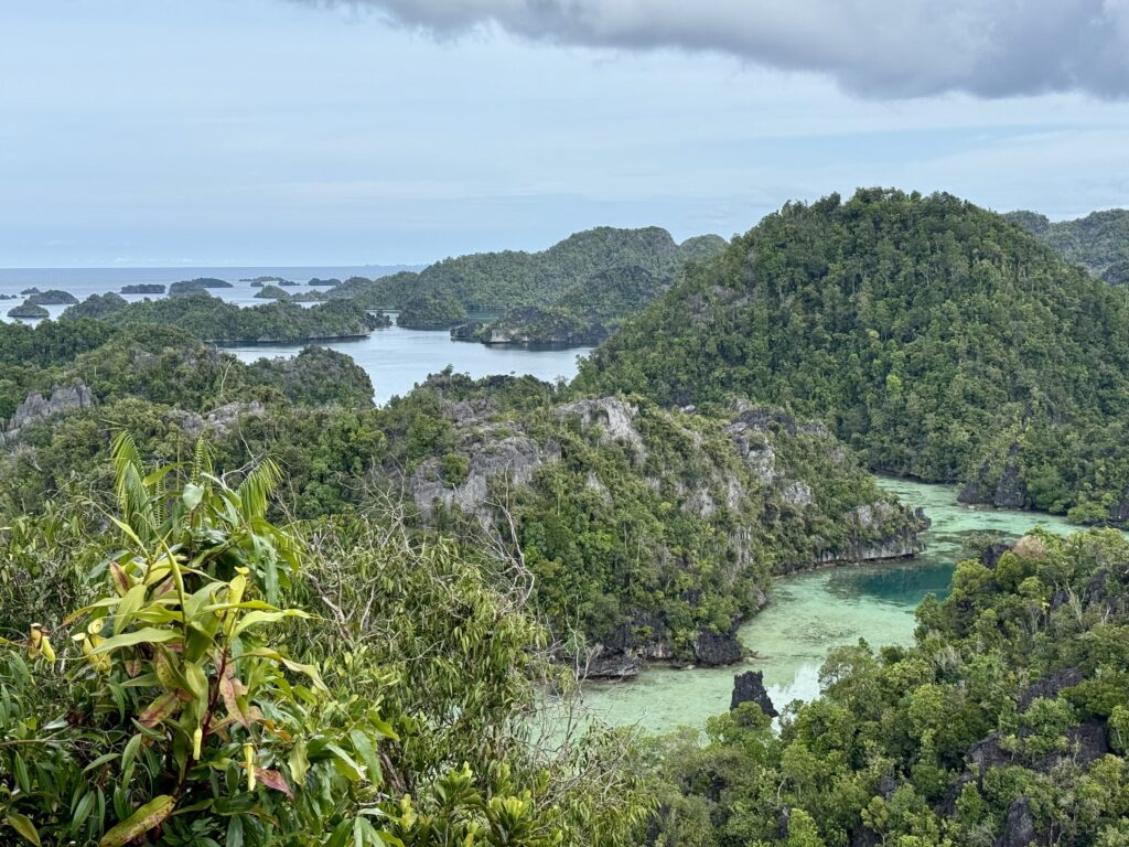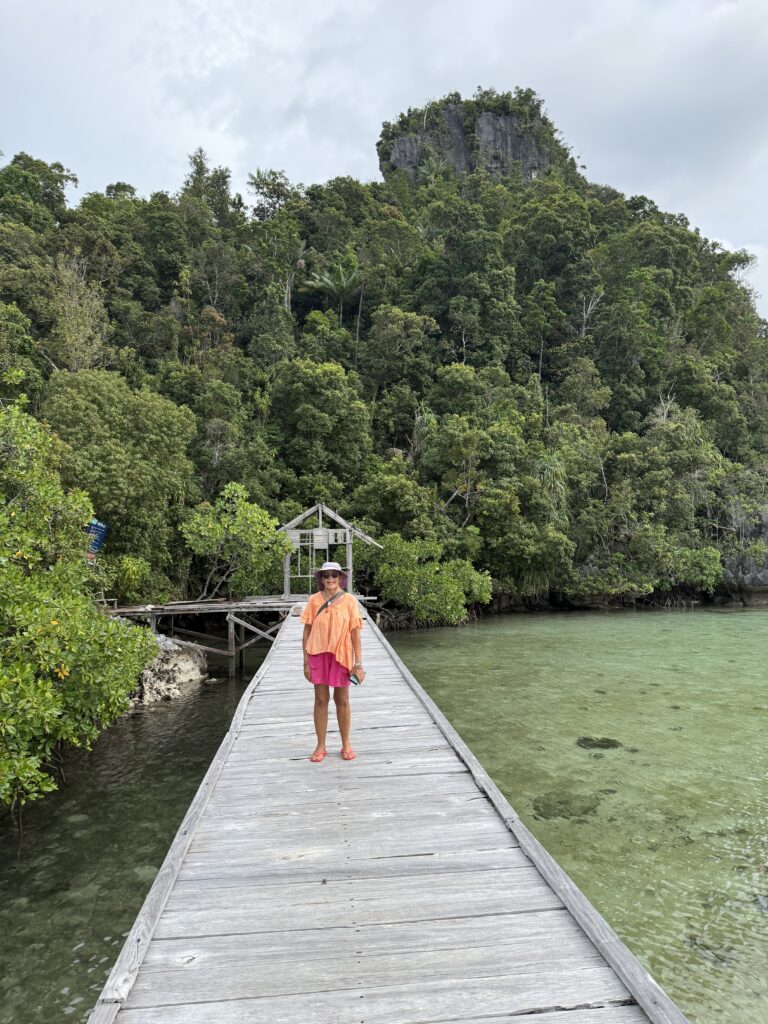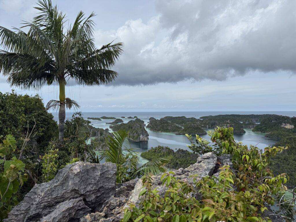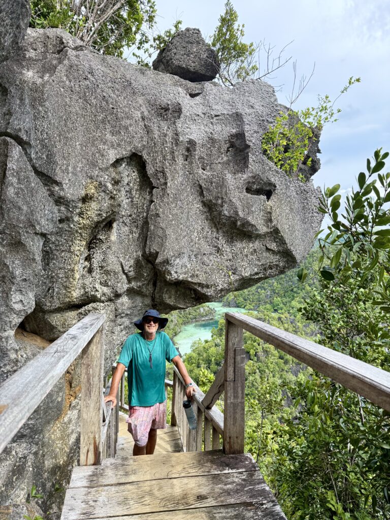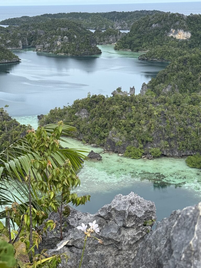 Late afternoon just as it clouded over and threatened rain we headed out in JeldiJeldi to explore the area. We had passed a long jetty and discovered it led to a wooden staircase that went to the top of the rocky island overlooking our anchorage. It was a hot sweaty climb up, well worth the effort for the amazing views. Sadly the staircase was in pretty bad condition with loads of broken and wobbly steps to keep us on our toes. It must have been a great effort to put the wooden stairway and walkway up. Lovely orchids on the way up growing out the rocks. At the bottom we met a group of 6 kayakers, 3 guests from Europe and 3 guides, kayaking around Misool, they have had some camping nights, and were looking forward to their Homestay tonight. There was a local couple sitting on the jetty, the one guide from the kayak group could speak good English, he told us we needed to pay the local guy. He explained that the government has pulled payment for the upkeep of the tourist sites, so it is up to the village and owners to maintain it. It certainly feels like tough times with lots of derelict looking Homestays about. .