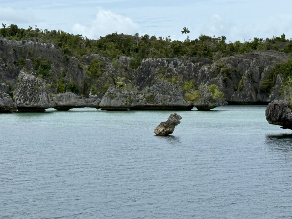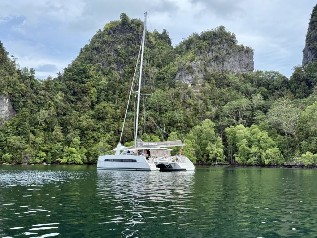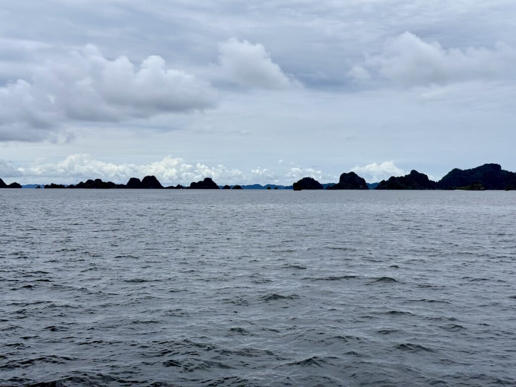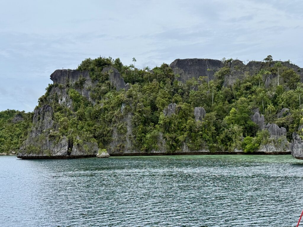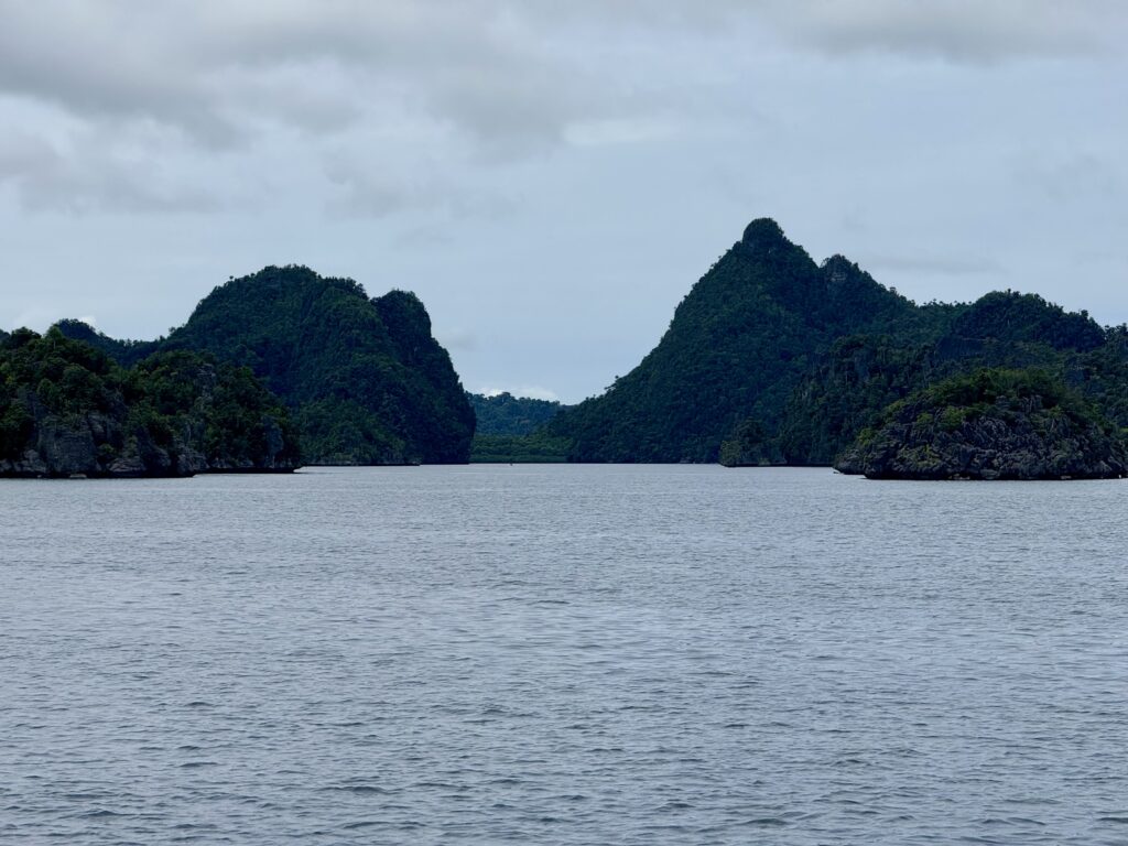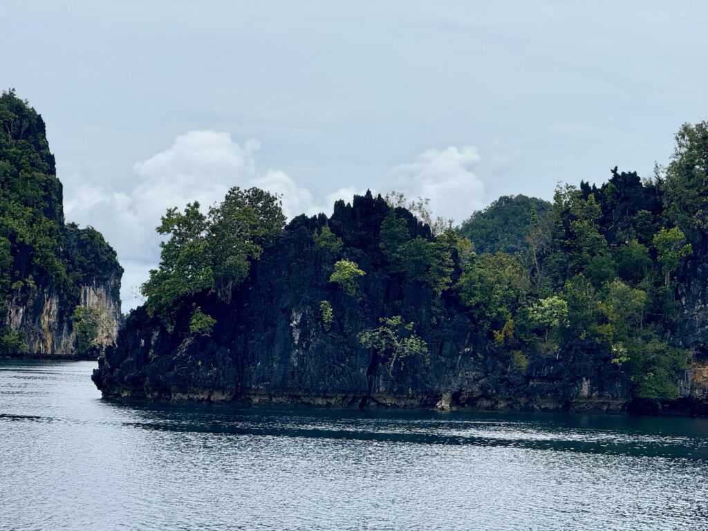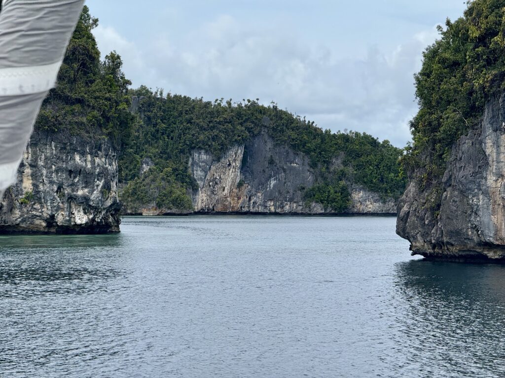 We had to leave early, that is before 7am, as the tide was up high, so we could get JeldiJeldi over the coral to get our ropes off the rocks. Thankfully it was very calm and the whole operation worked like a dream. Rowan was sorting out the stern lines and my job was to keep the boat from drifting before he got back.. Then our 80ms of chain and anchor came up like a dream, we were soon off and out the bay. It was about 15 miles to our next destination, heading west, motoring gently north of the continuous string of islands. Grey skies made the phots very flat and did not do the scenery justice. Absolutely no wind, so no point in getting the sails up.