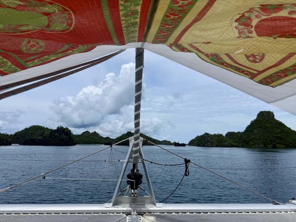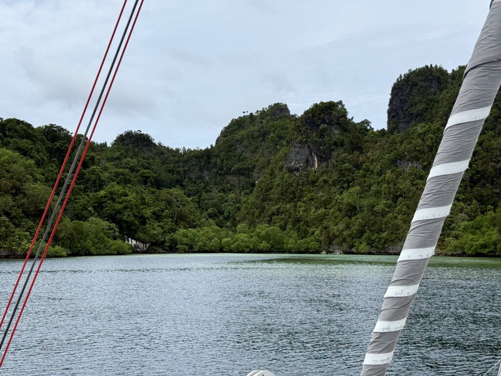We had a lovely evening back on PolePole, the insect noise is unbelievable, there was a cacophony of squawking Hornbills all returning to their roost for the night, the noise from their flapping wings is incredibly loud. Rowan celebrated by having his favourite rack of lamb chops on the BBQ. They were just cooked when the gas ran out for the BBQ. Another chore to do in Sorong. Our food supplies are really low, no eggs, very little fresh food, – we have half an onion, 3 carrots a third of a red cabbage, a handful of new potatoes, a couple of bananas and 2 green Pawpaw and that is it!. We have plenty of store cupboard goodies and tins to eat. Breakfast is now beans on toast. At least I have plenty of flour to continue making bread, and we have plenty of milke for tea and coffee. We will restock in Sorong in 10 days.