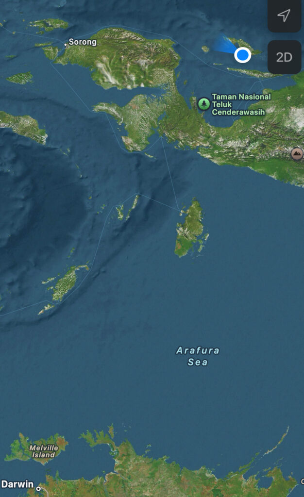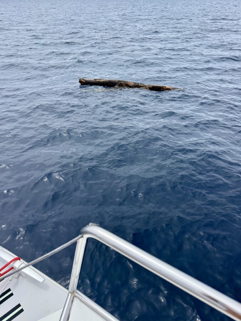 Of course the predicted wind never materialised so we had to motor, hoping we might catch some wind when we were out of the lee of Biak island. We had been going a couple of hours when we suddenly started noticing enormous uprooted trees in the water, some areas it seemed to be slowly swirling as the logs were all gathered together with plenty of discarded rubbish. So sad as we feel very remote here, we have left Biak town behind and there is very little sign of habitation or fishing boats, just these floating, soaked tree trunks. We had a lot of narrow misses, a few hits, but luckily very gentle as we crawled by. Some are virtually submerged, so hard to see in the waves. I wonder why they don’t sink if they get so waterlogged, you can see they have been in water for ages, covered in barnacles and growth.