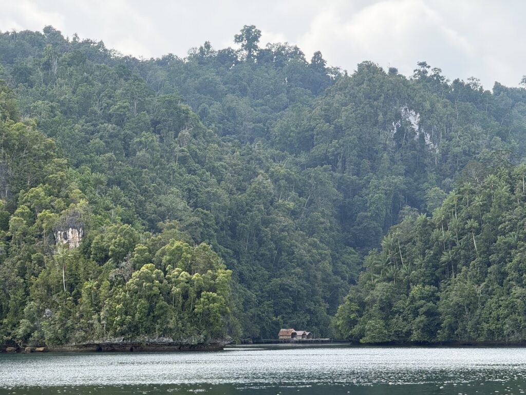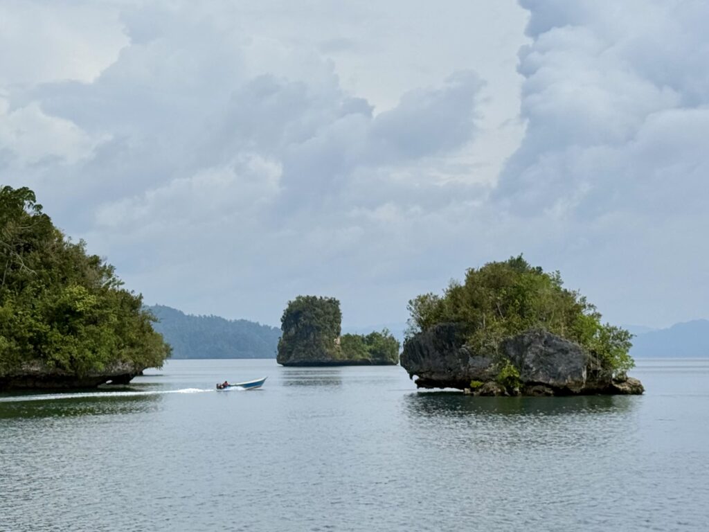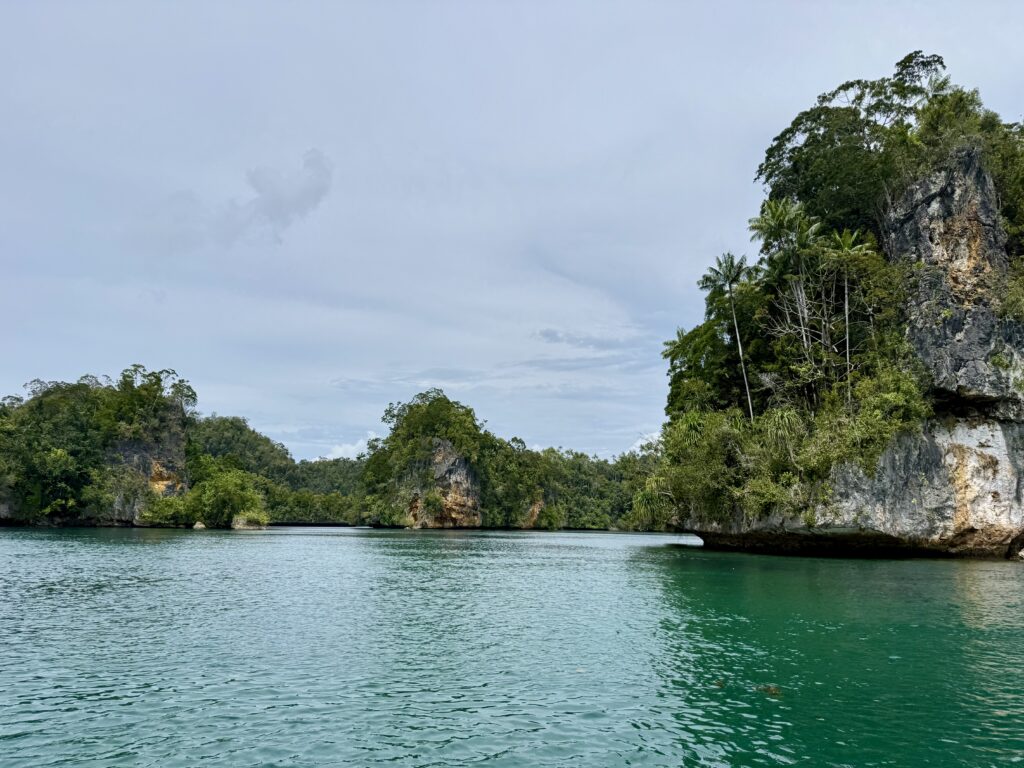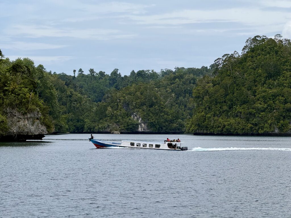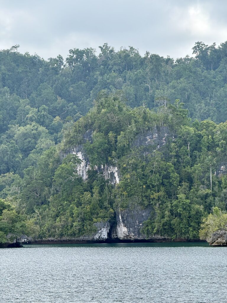We are in a huge bay, there is a narrow passage that links this bay with the sea the other side. It looks really interesting and will bring us out at Pef Island that had the lovely Raja4divers Resort on it. It saves doing a very long trip around the island. There is an anchorage at the start of the passage where we headed to before breakfast. The anchorage is amongst loads of eroded karst islands, there is an abandoned homestay, and that is it. Incredible to have the place to ourselves, except for the long boats going back and forth through the passage to a village on the other side, this would definitely be the shortest route for them to Waisai.