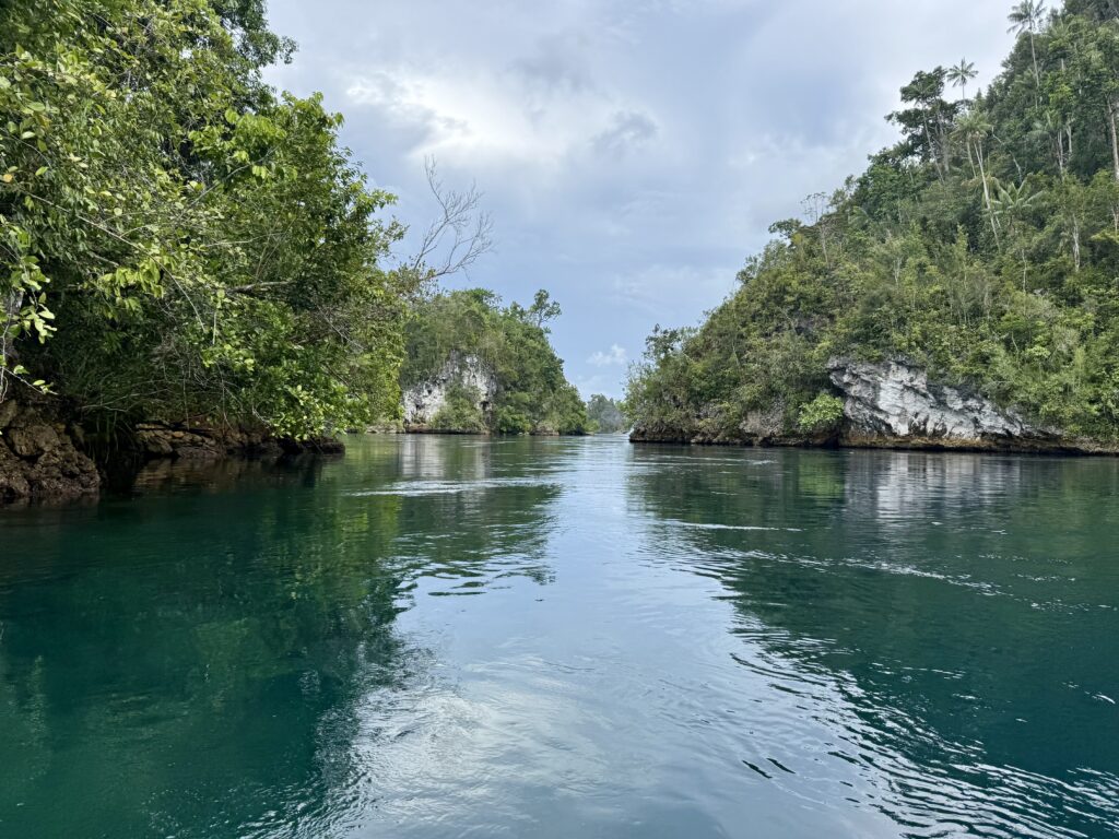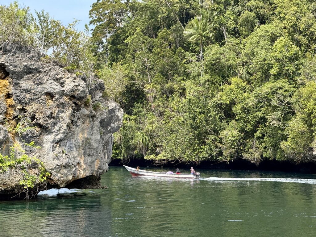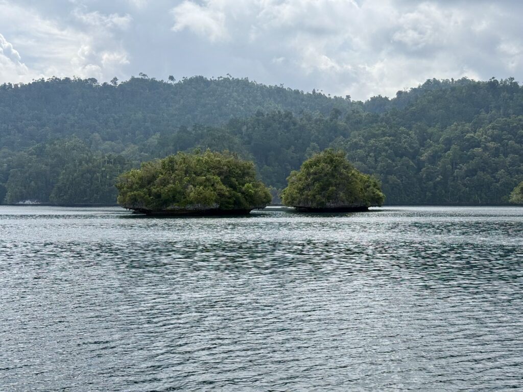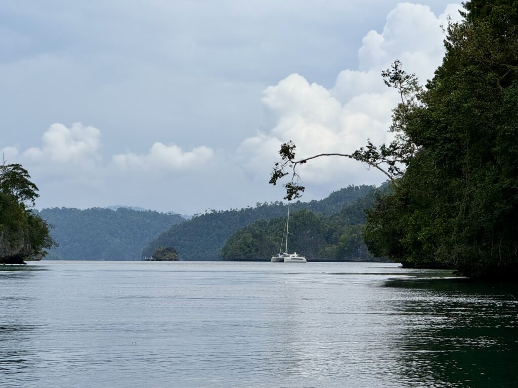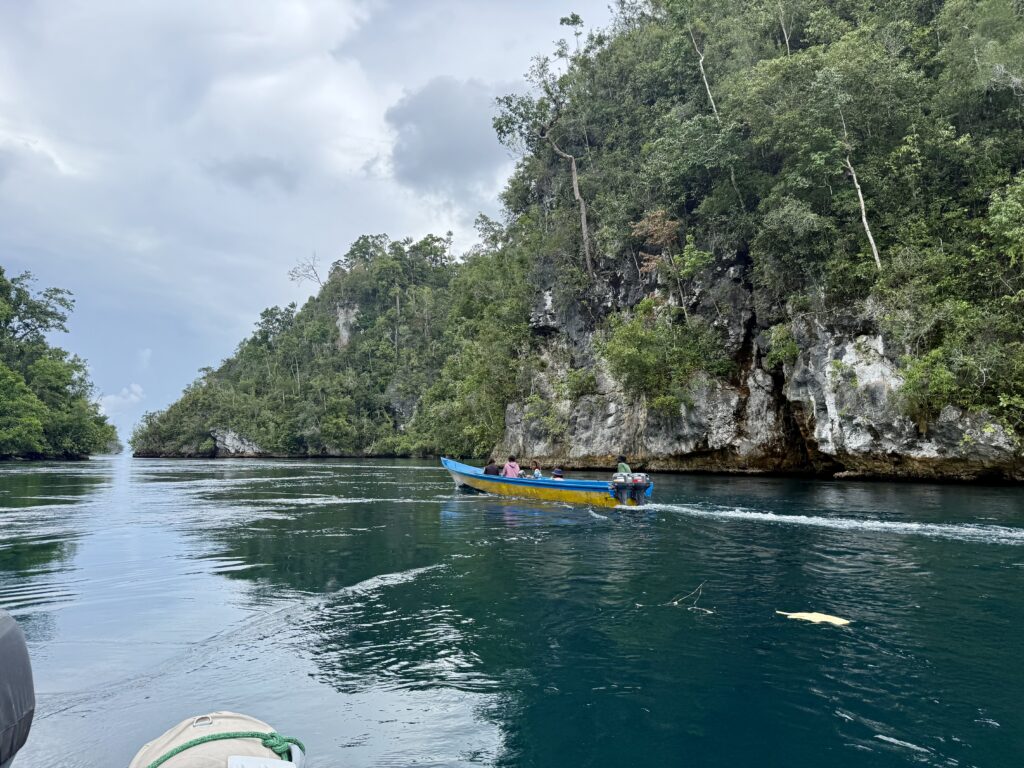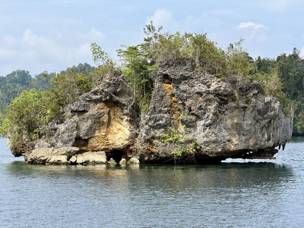 We are in a huge bay, there is a narrow passage that links this bay with the sea the other side. It looks really interesting and will bring us out at Pef Island that had the lovely Raja4divers Resort on it. It saves doing a very long trip around the island. There is an anchorage at the start of the passage where we headed to before breakfast. The anchorage is amongst loads of eroded karst islands, there is an abandoned homestay, and that is it. Incredible to have the place to ourselves, except for the long boats going back and forth through the passage to a village on the other side, this would definitely be the shortest route for them to Waisai.