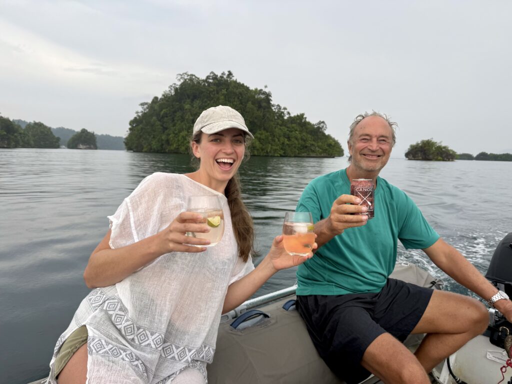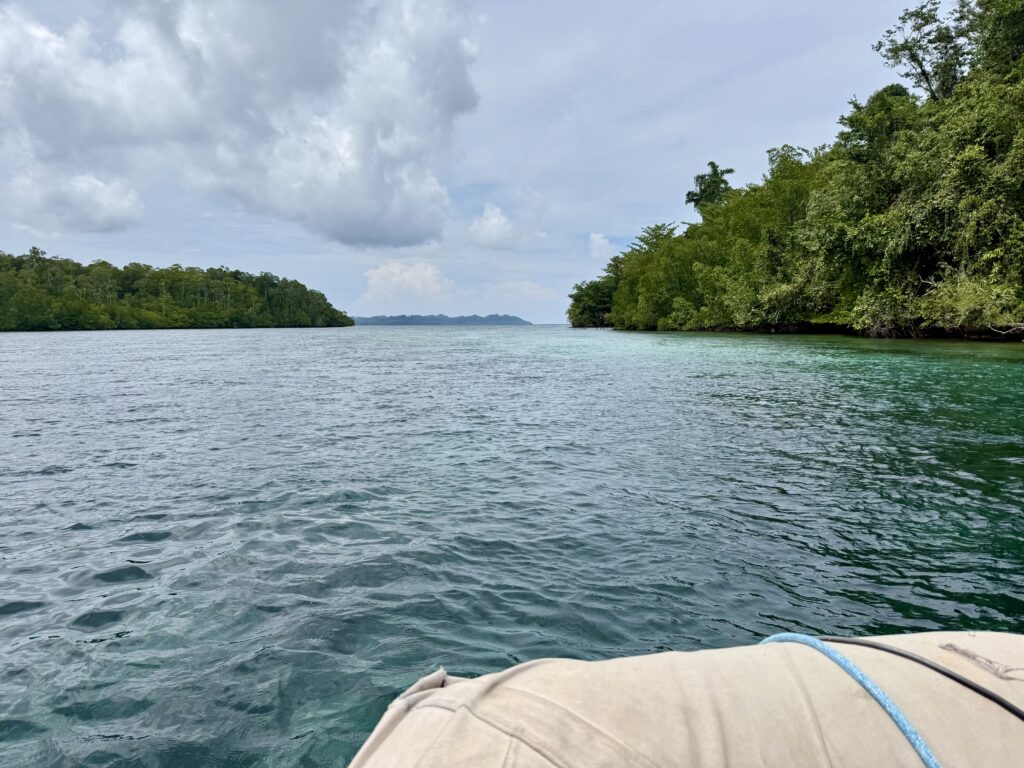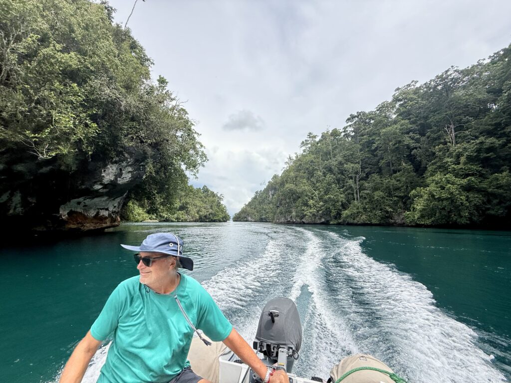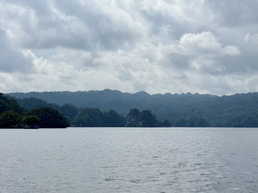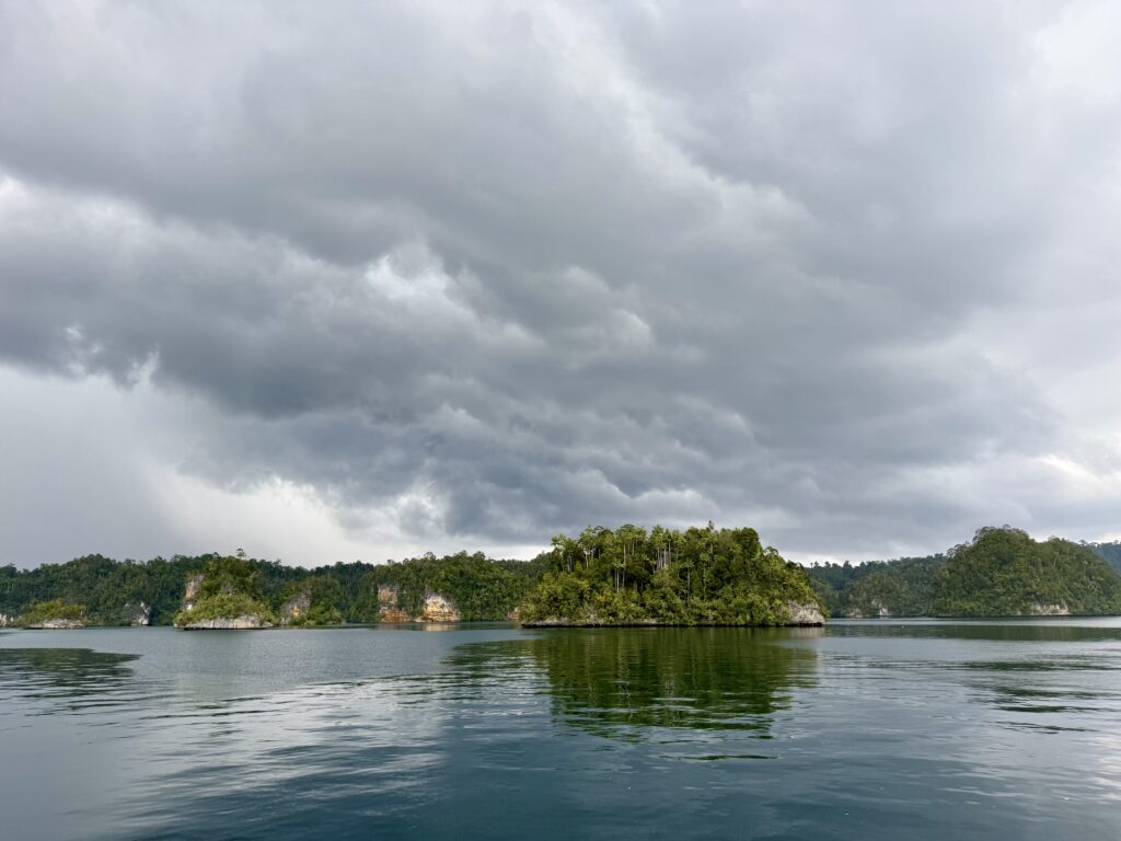 We are in a huge bay, there is a narrow passage that links this bay with the sea the other side. It looks really interesting and will bring us out at Pef Island that had the lovely Raja4divers Resort on it. It saves doing a very long trip around the island. There is an anchorage at the start of the passage where we headed to before breakfast. The anchorage is amongst loads of eroded karst islands, there is an abandoned homestay, and that is it. Incredible to have the place to ourselves, except for the long boats going back and forth through the passage to a village on the other side, this would definitely be the shortest route for them to Waisai.