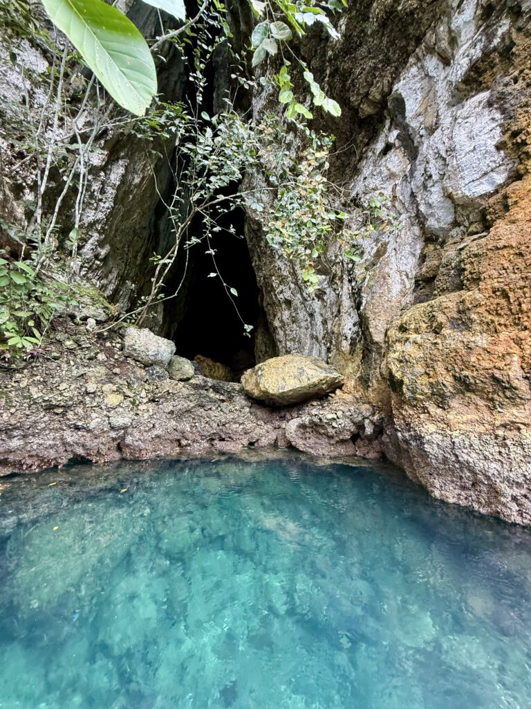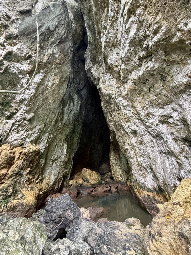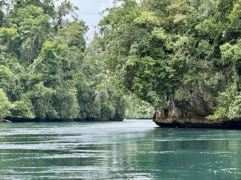 We had passed a big cave full of bats and decided to go back there for evening drinks to see the bats leaving for the evening. Just after 5pm when the rain stopped we took our G&T’s and some houmous that I made in the afternoon to the cave. We tied up to a tree and sipped our drinks hoping to see some bat activity, it didn’t materialise. I think we missed the bats departing for the evening. We had a very enjoyable time anyway plus we tested out the high tide timings so we know what time to leave tomorrow. We will have to leave about an hour before high tide to have the current against us.