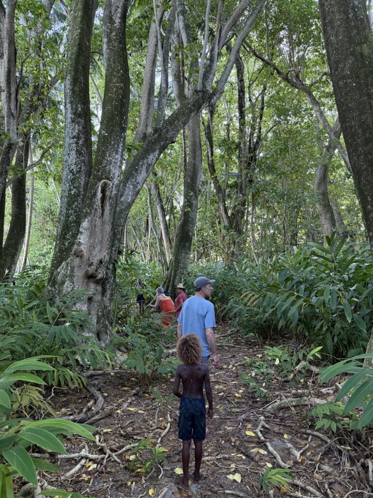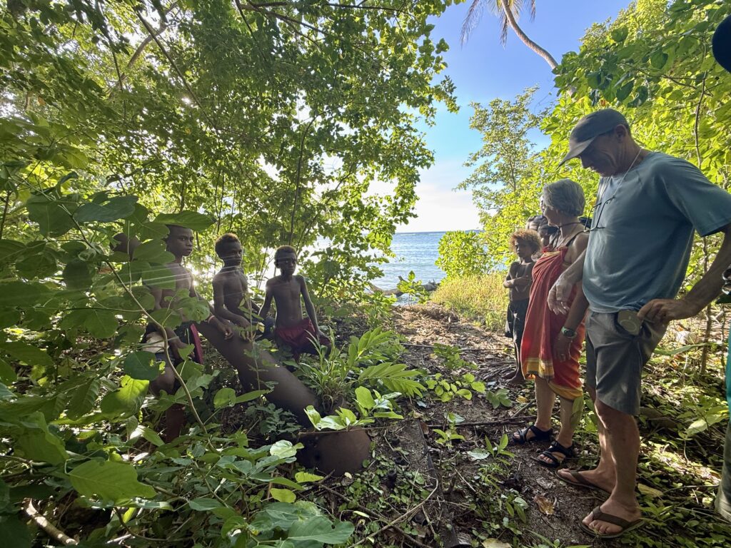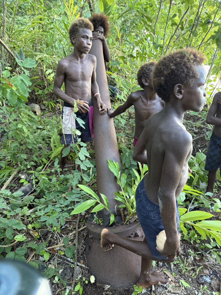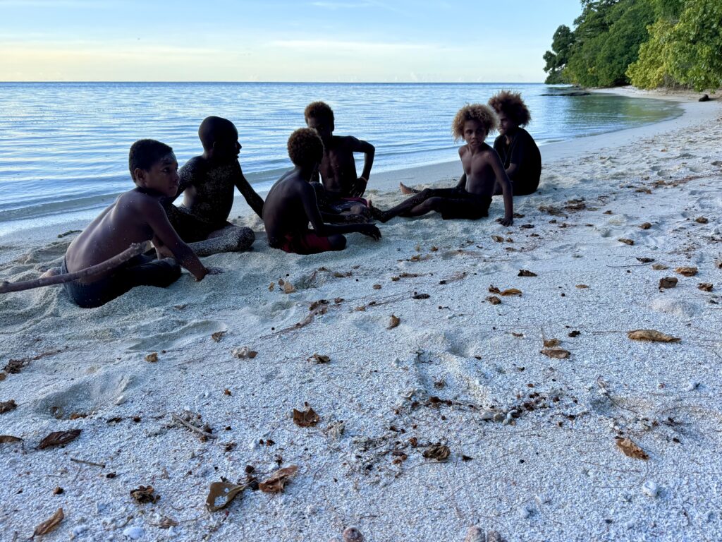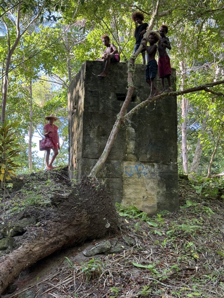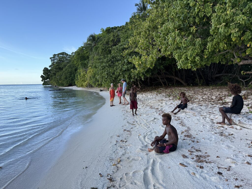 Late afternoon we went into the village to take some more goodies for the kids – books and pens. We had arranged a walk around the village to look at the Japanese bunkers on their land. Plus the remains of a gun. This end of the island was obviously a strategic look out post for the Japanese, some of the bunkers were in amongst the houses. The kids were very cute who guided us around. The chief/leader had told the kids to earn some money while they are on their two week Independence anniversary holiday. They all go to school in Kavieng and seem to be on holiday here with the grandparents we think. They took us for a walk to the other end of the island which had a lovely white beach and outlook. We gave them some money for the coconuts they had cut for us today and said we would take more tomorrow.
