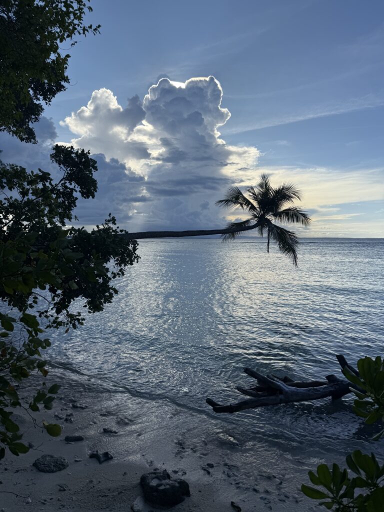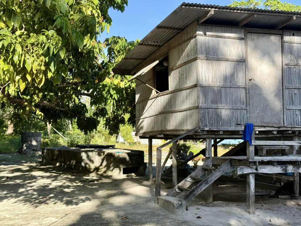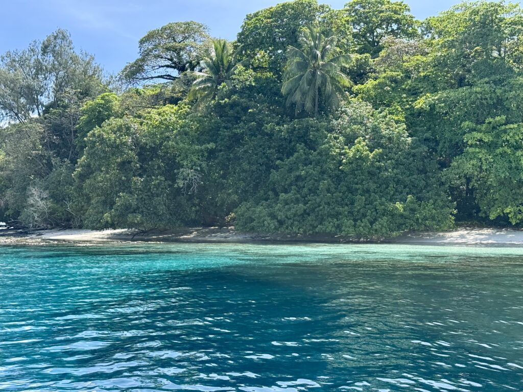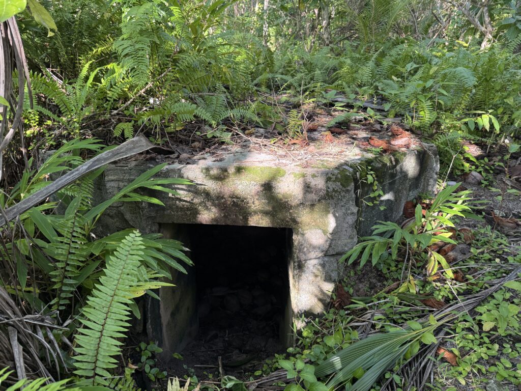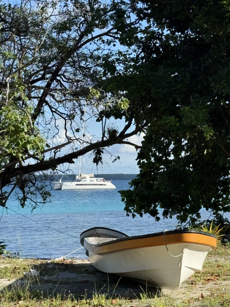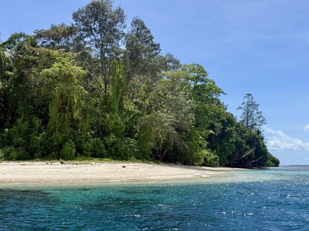 Late afternoon we went into the village to take some more goodies for the kids – books and pens. We had arranged a walk around the village to look at the Japanese bunkers on their land. Plus the remains of a gun. This end of the island was obviously a strategic look out post for the Japanese, some of the bunkers were in amongst the houses. The kids were very cute who guided us around. The chief/leader had told the kids to earn some money while they are on their two week Independence anniversary holiday. They all go to school in Kavieng and seem to be on holiday here with the grandparents we think. They took us for a walk to the other end of the island which had a lovely white beach and outlook. We gave them some money for the coconuts they had cut for us today and said we would take more tomorrow.