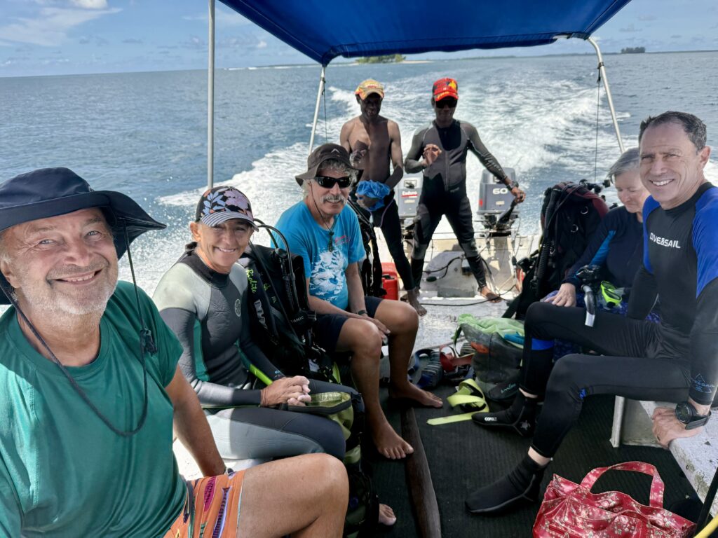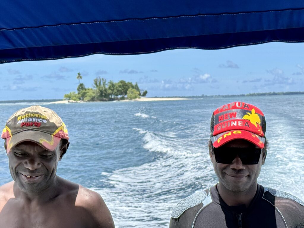 Dorian picked us up at 9am, in his rather rickety old boat. He picked up Claudette on the way as she wanted to dive too. I was the only one not diving but went along for the ride, planning to snorkel but left my earplugs behind. Just as well I didn’t swim as I didn’t want to encourage my cold to get any worse, thankfully it hasn’t gone to my chest. We went to one very picturesque uninhabited little island and they had a good dive, with great visibility a vibrant coral wall at about 20m, the highlight was seeing popcorn fish, leaf fish and loads of lion fish, a variety that only lives around PNG. Some also saw the little sand eels that pop their heads out of the sand like little Jack in the box. We had a downpour between dives, which kept it beautifully cool. The second dive was good too although the visibility was not as good. I spent the time talking to Dorian as he had burst his ear drum and was not diving, he had two locals lads diving, who were good at pointing things out. Dorian has lived here for 25 years, his wife and daughter, who is 16 years old, have returned to Hout Bay in South Africa a couple of years ago. He is trying to sell his business as tourism has died, it doesn’t sound like that is too likely. You can’t buy property in PNG, so he has nothing to tie him here, a lonely existence!