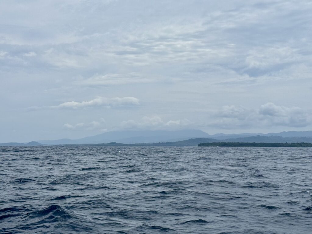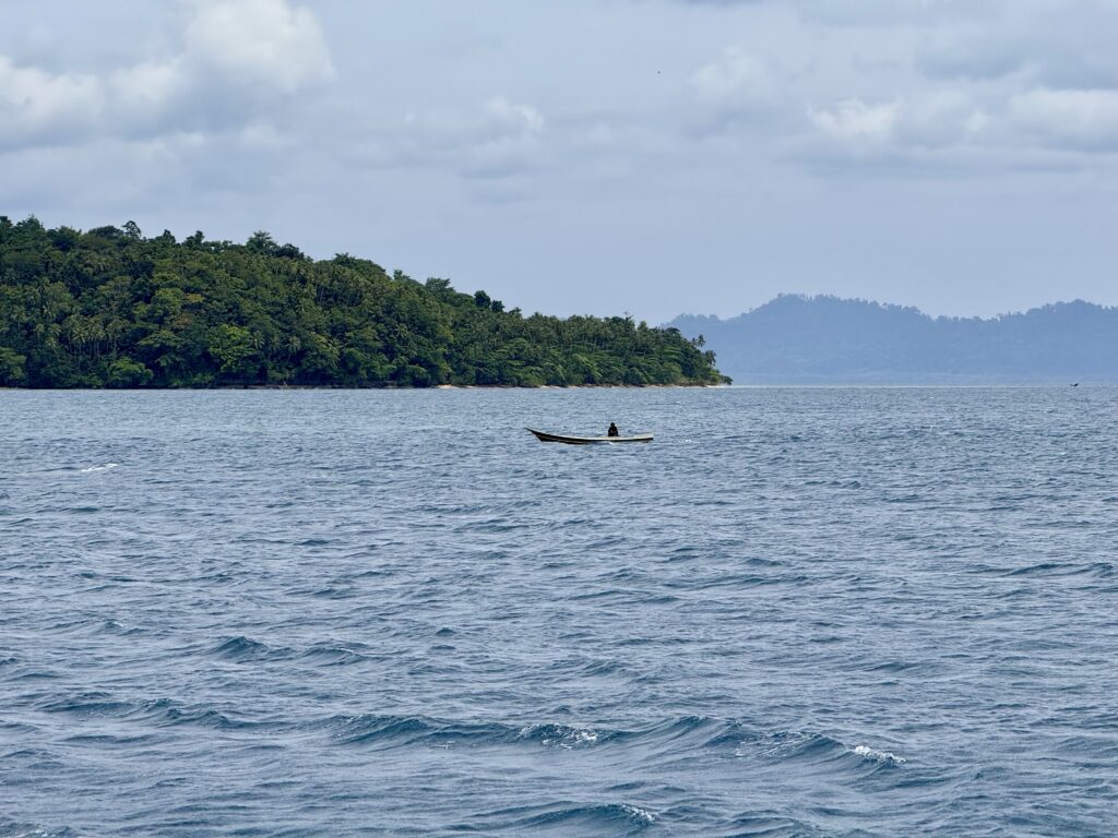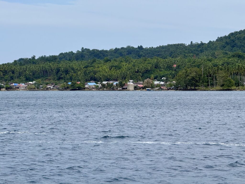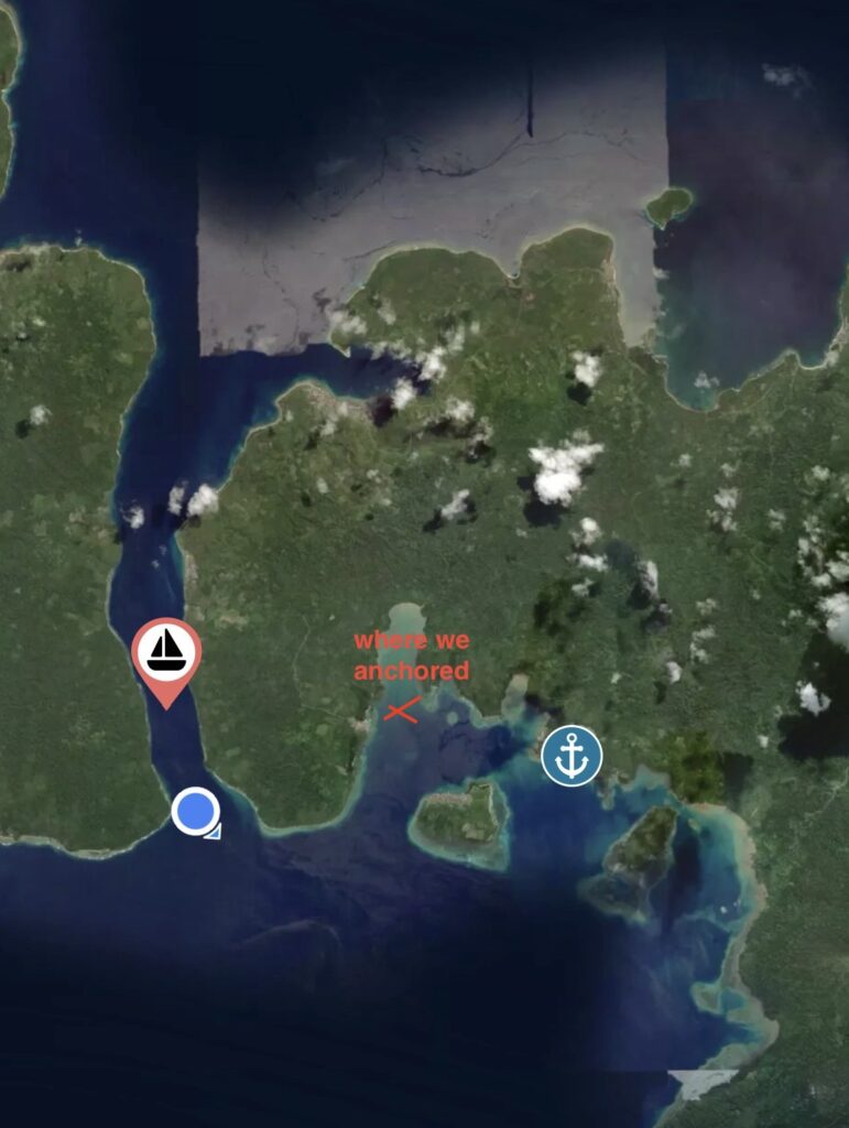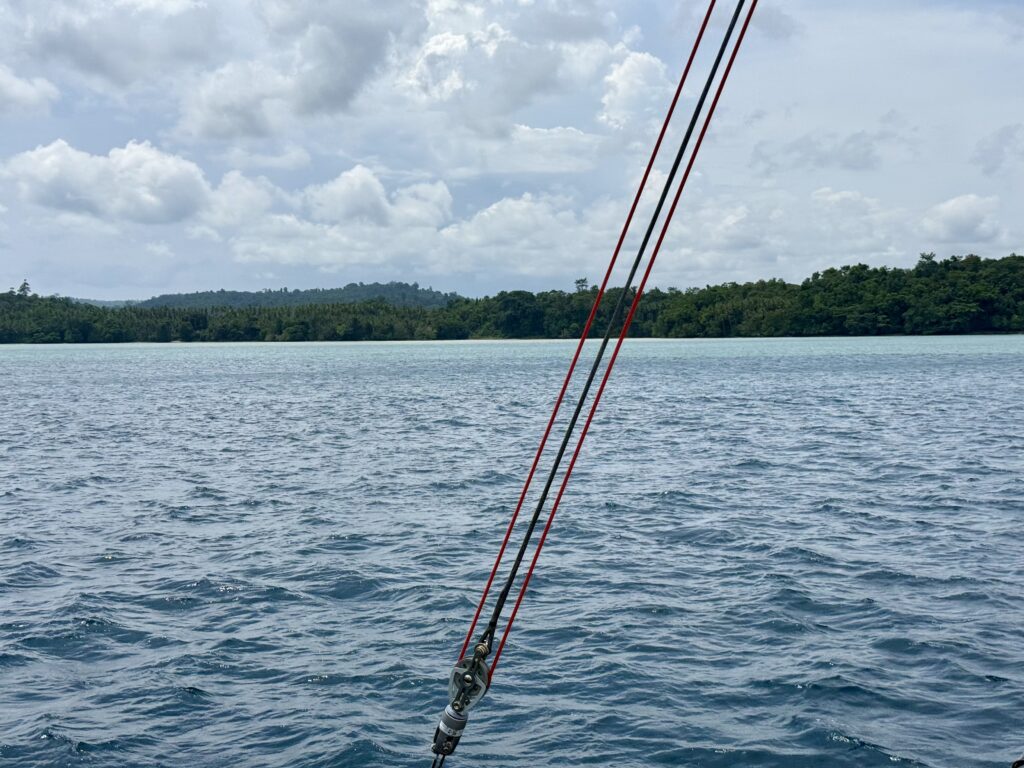 Our overnight pootle had worked well, just a few squalls to work around, Rowan had a fishing boat that he had to motor around. At first light we had the main sail back up and were sailing nicely, the sea got quite choppy with big waves. At midday we could see the big island we were aiming for with the gap through the middle. We got the sails down to motor through, there is not much written up about going through the gap, certainly nothing on our NFL App. Rowan’s charts all said it was wide and deep enough, just some shallow areas to avoid. I sat up front and with our headphones on we could communicate the whole hour it took us to get through. It was about 5 miles long, with a couple of villages along the way, and some palm plantations. There was some very light blue water, which usually means shallower water but this was still over 30ms deep, it made a distinct line in the water, we couldn’t work out what was causing it, it could be fresh water coming in, but we could see no obvious rivers. There were some pockets of lovely dense jungle. We must have entered at around slack tide as there was not much current, but as we got near the end there were a couple of knots of current against us, it created some turbulent water.