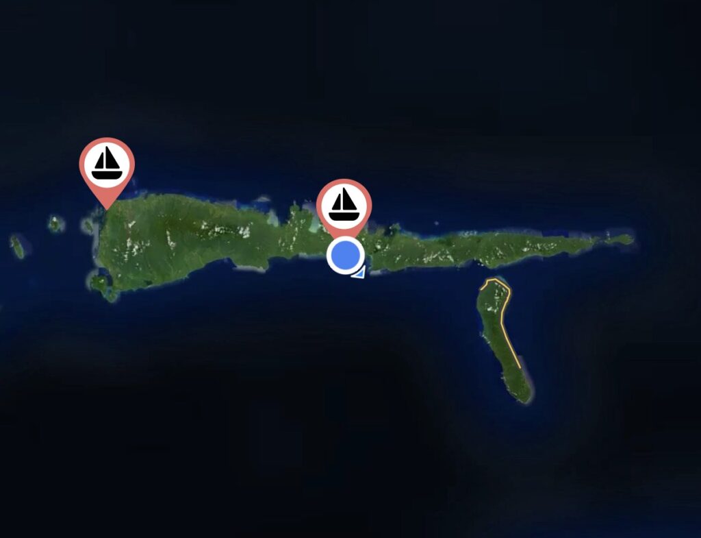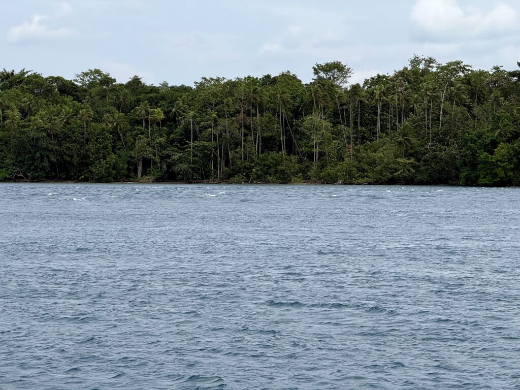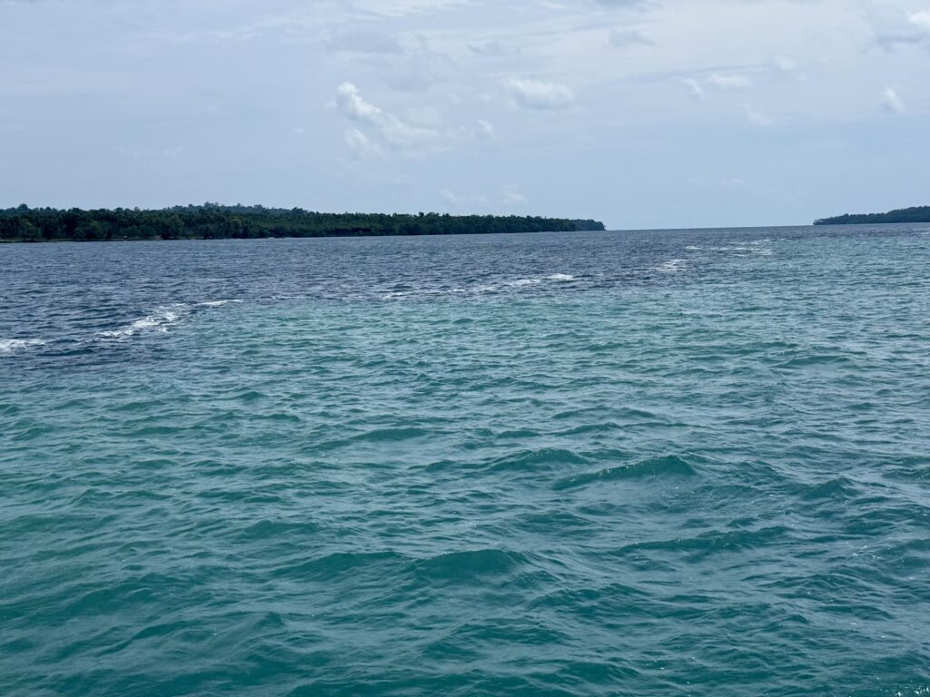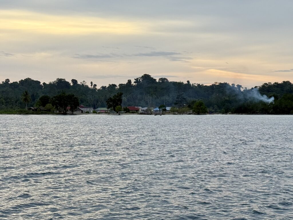 Our overnight pootle had worked well, just a few squalls to work around, Rowan had a fishing boat that he had to motor around. At first light we had the main sail back up and were sailing nicely, the sea got quite choppy with big waves. At midday we could see the big island we were aiming for with the gap through the middle. We got the sails down to motor through, there is not much written up about going through the gap, certainly nothing on our NFL App. Rowan’s charts all said it was wide and deep enough, just some shallow areas to avoid. I sat up front and with our headphones on we could communicate the whole hour it took us to get through. It was about 5 miles long, with a couple of villages along the way, and some palm plantations. There was some very light blue water, which usually means shallower water but this was still over 30ms deep, it made a distinct line in the water, we couldn’t work out what was causing it, it could be fresh water coming in, but we could see no obvious rivers. There were some pockets of lovely dense jungle. We must have entered at around slack tide as there was not much current, but as we got near the end there were a couple of knots of current against us, it created some turbulent water.