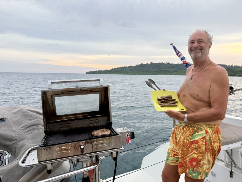 Out the other side we had seen an anchorage and planned to overnight there, it was about 5 miles away. Rowan looked at the charts and found a closer bay that had a muddy bottom that looked perfect for anchoring in. We went there instead, had the anchor down mid afternoon and enjoyed a relaxing afternoon. There were two small towns across from us, with endless long boats going back and forth. Loads came by to inspect us, lots of greetings and curious glances. I am quite sure they don’t get many boats anchoring here, so we were a real novelty. Rowan was just cooking our steak on the BBQ when two men arrived with 4 coconuts for us, they hopped on board, full of curiosity. But mainly they wanted a photo of us with them on the boat, and they each got an extra one with me. So funny they seem to have not much money but make a living from something as they all have mobile phones. We were just thinking they most probably have never left these islands, and never even been in a car let alone a plane, but they all have a mobile phone.