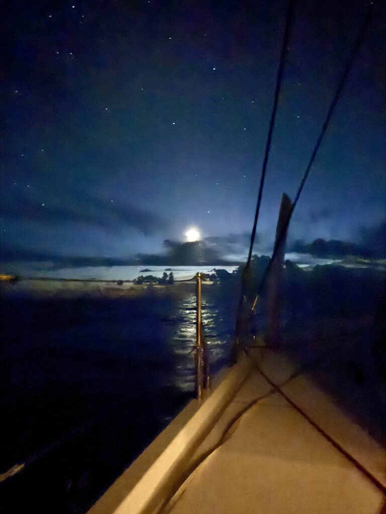 The day chugged by. The same fishing trawler passed in front of us this morning, Rowan called them on the vhf, we were surprised to get a prompt reply with fairly good english. Rowan was worried he might have nets out, luckily he said they had no nets out, they were just looking for fish. We have had a terrible message a while ago on a sailing Indonesia WhatsApp group of a boat that got caught up in a trawler’s nets in the evening. The trawler started hauling in the nets and they were being dragged along and in danger of breaking their rudder or whatever the nets were stuck on. The tension was so much they could not boat hook the nets to cut it free, it took until the morning to get the trawlers attention when they were finally cut free. Sounded horrendous as the sailboat was taking in water, not an ordeal we want to experience. From here on we will see a lot more fishing trawlers, the recommendation is not to do overnight passages.