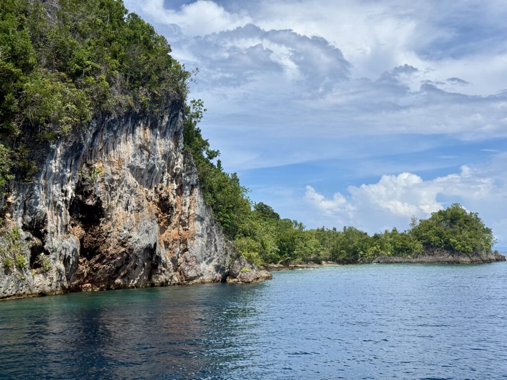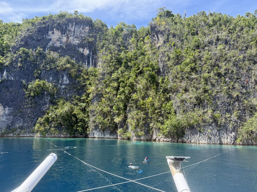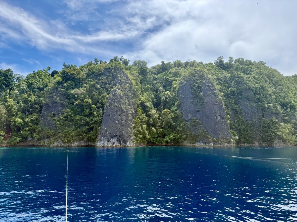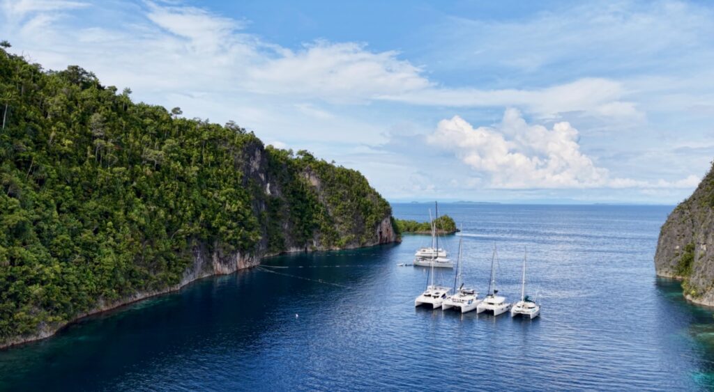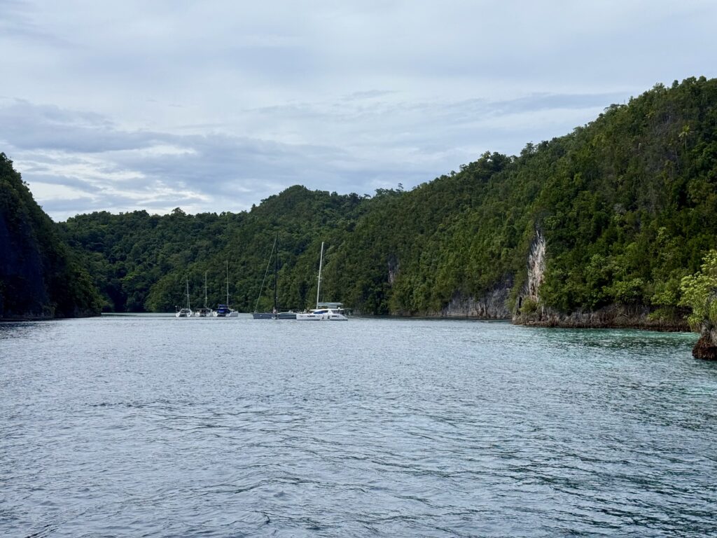 We had breakfast on the way as we had about 3 hours of motoring to Piaynemo. This is one of the best diving areas in Raja Ampat, but there are no easy anchorages, so it is tricky for yachts. The only area suitable for yachts to anchor is in a bay which has a defunct zip line that we and most yachts cannot fit under. The only other place is a narrow inlet that is very deep and space for a couple of boats, you have to tie up front and back across the fjord like steep sides of limestone walls. We had been watching on our app to see if it had a boat in it, and over the last few days it has got up to 4 boats, so we expected little chance of fitting in. We have met most of the boats on our travels around, Rowan sent a message to them and asked if it was possible to get another boat in, they welcomed us in and said they would raft up to make space. We arrived around midday, it was so impressive, there were 3 catamarans rafted together, another Cat plus a big monohull. We were told to wait outside while the fourth cat offered us their floating lines and they moved to join the raft, making a total of 4 cats rafted together. Incredibly generous, they then tied us onto their lines. All the floating lines are attached to chain that goes through holes in the limestone rock. It looked like a spiders web of lines tying everyone up, our two out the back were crossed over to stop us moving with the tide too much and one long one out front. It really saved us a huge amount of effort and was an incredible spot to be moored. The guy on the monohull was obviously a little nervous about being hemmed in by us, he we went through an emergency drill with us in case a squall hit and anyone needed to leave. Nobody can leave without us dropping our lines. It was definitely a good idea to think about an exit strategy.