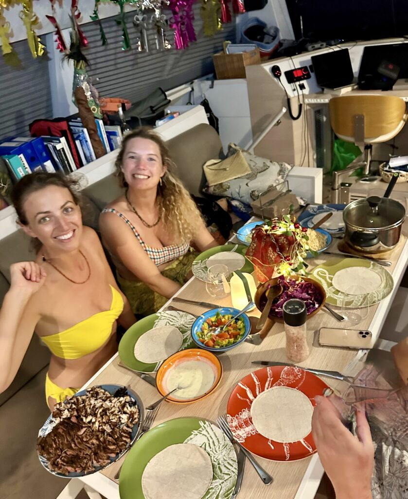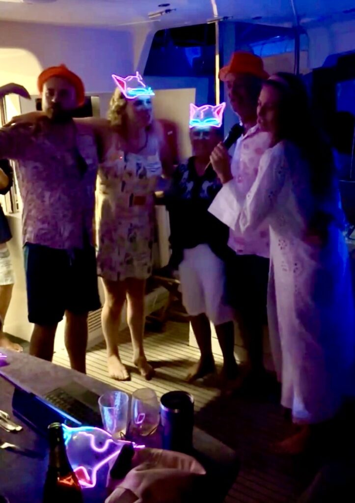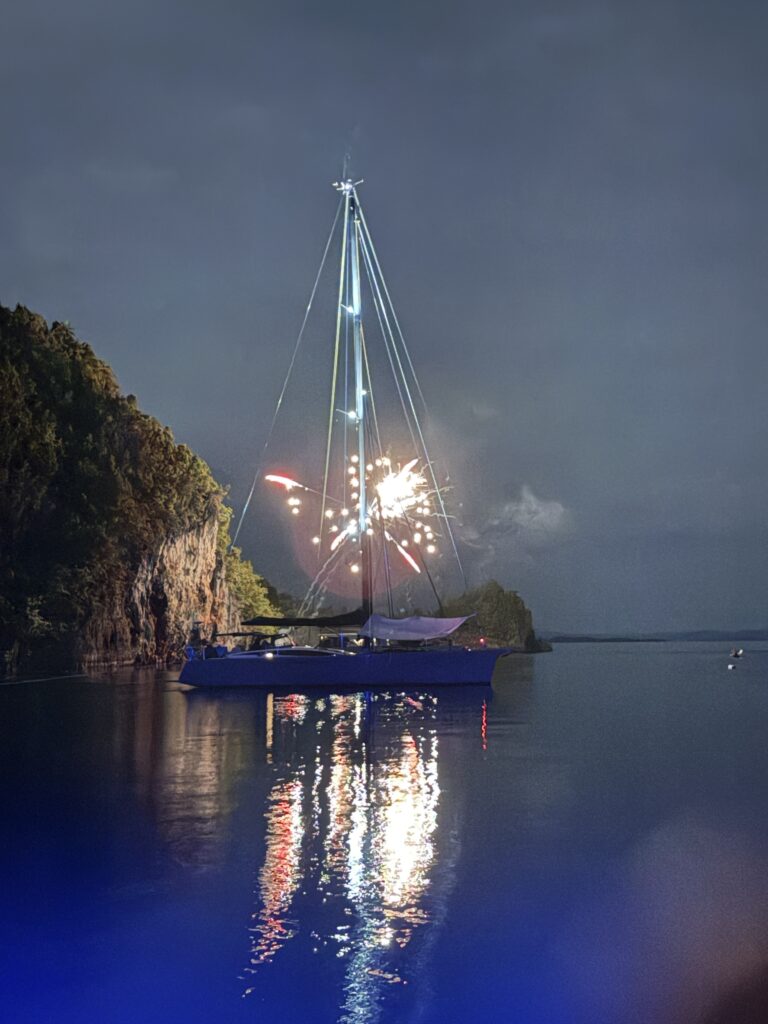 Phoebs and Dani made a delicious supper of chicken and steak wraps, finished with some delicious Fortnum and Masons florentines. Such wonderful treats for us. Sound 9pm we headed to the Cat raft and had drinks and charades on the first boat, before moving onto the South African (who lives in Australia) Cat where he had an enormous Karaoke set up, plus an amazing dressing up box. Our kids brought down the ages substantially and got stuck into the karaoke. Milly is a great singer, as is Phoebe so they were a formidable two on the microphones. The NZ monohull has an english wife who also enjoyed belting it out. It was very entertaining and the night slipped by. At 11pm three of the men went to set off the fireworks they had bought. It was a really dramatic display, seriously impressive. Luckily one of the guys was a fireman, which was reassuring as they set them off on a tiny beach near Polepole. By the time they got back it was nearly countdown to midnight. The first time we have seen in the New Year in ages! We left shortly afterwards, as we have a busy day of sightseeing tomorrow before Luke and Milly head home. The party continued for a while, it was very kind that they let us gate crash their New Year’s Eve celebrations.