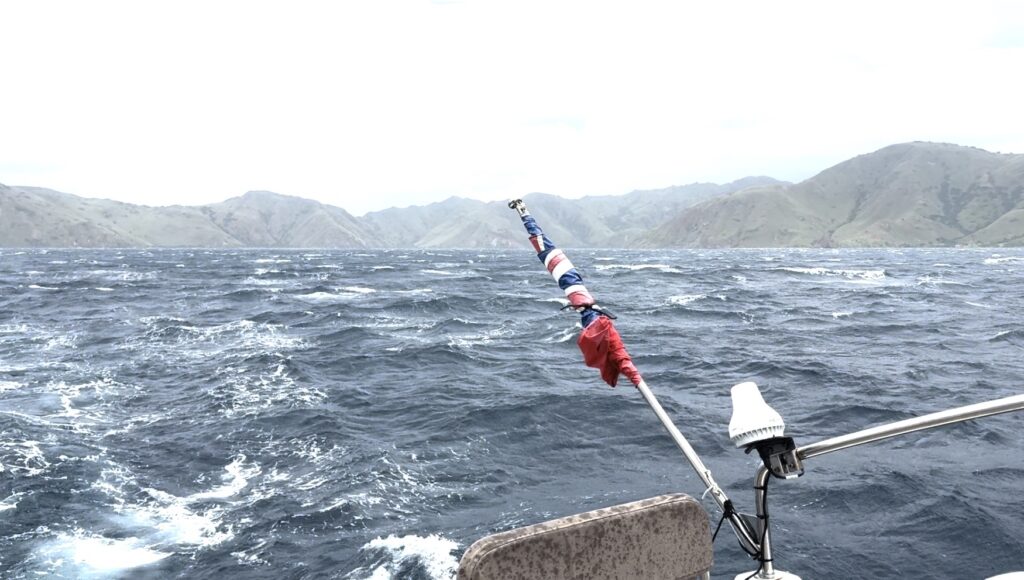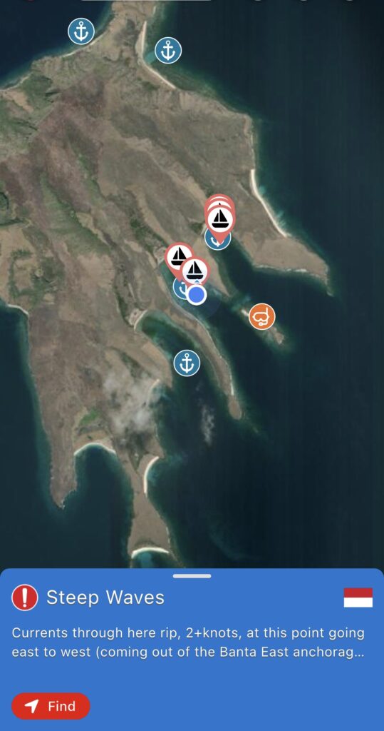 We left our sheltered side of the bay and found the wind was picking up and the sea was pretty rough. Things progressively got worse with peak winds of 37 knots and huge current against us. It was absolutely flabbergasting, we had the engines at full throttle trying to aim for our waypoint and the current was just taking us further and further north rather than heading south to our bay. We were gaining about two miles west in an hour in huge choppy waves. It was very unpleasant. We knew from our snorkel yesterday that the tide was going to turn around 3pm, and like clockwork we suddenly got going and gained huge speed as the tide went with us. There were a few boats in the two nearest bays, so we had thought we would go to the most southern one, but as we passed the second bay with only one boat in it we had had enough and decided to go there. It was a relief to get out of the rough sea. We got the anchor down around 5pm, thank goodness the Crickmores left early as we would not have wanted to get in here in the dark. We deserved a very big drink tonight and collapsed into bed, it has been a busy few weeks, we have to stay here at least until Saturday to let the storm and swell pass, so we can relax and recover now we are safely tucked up.