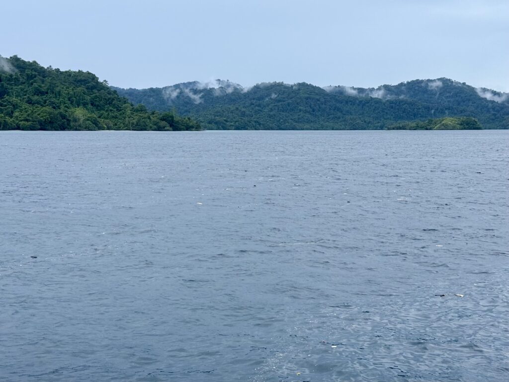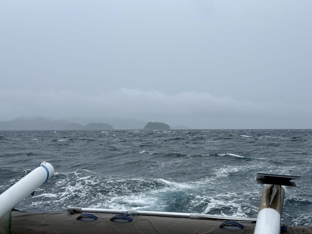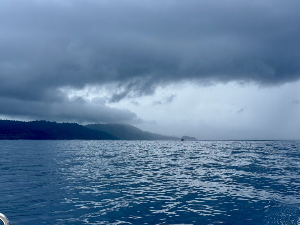 We could see huge black clouds gathering, happily we had safely navigated our way out the fairly tricky anchorage, before the squall hit us. It was going the same direction as us, it quickly caught up with us and really churned the sea up, loads of current here too, so it soon became a short choppy sea, which stuck with us for ages. A complete white out, so pleased that Luke had brought out a new AIS antenna which had solved the problem of our faulty AIS, meaning people can pick us up on the charts.