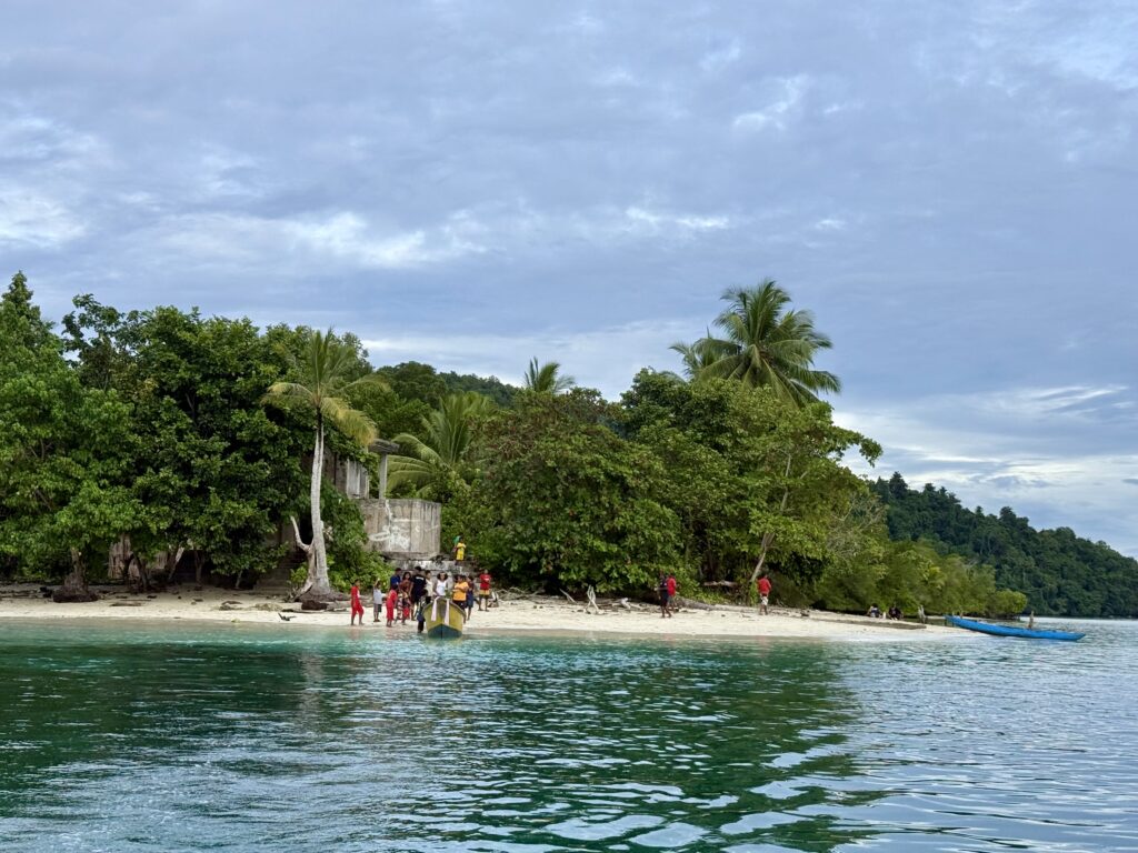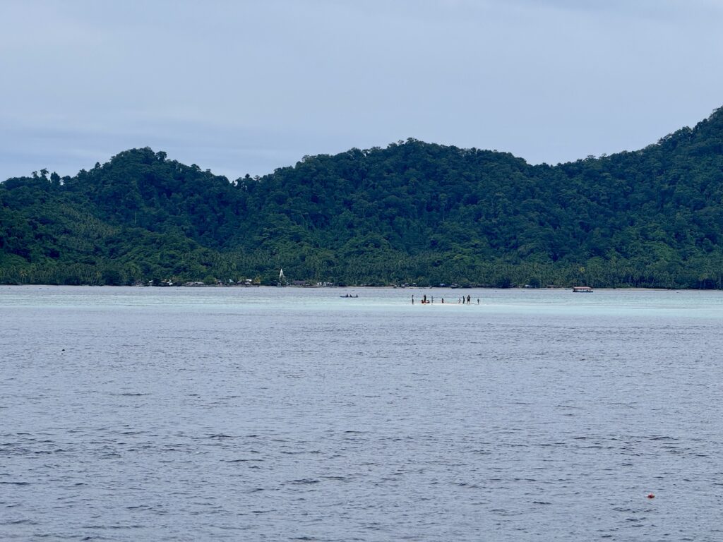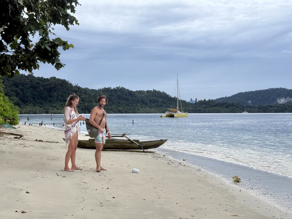 We finally got to the anchorage in a lovely big bay, only to find Banana Split and another yacht there. We went to the other side which was much quieter, being a bit further away from the village. Once settle we headed over to the beach where the yachts were for a walk along a lovely white sandy beach. We arrived and some local girls produced a couple of coconuts for us, when she saw we were keen, she was dispatched to climb a very tall palm tree to get more for us. It gave Phoebs the heebie jeebies watching her up there with a panga. We opted to go for our walk and not watch. It was a beautiful beach full of gorgeous shells, and a mountain of litter sadly. On our return it appeared that most of the village were with JeldiJeldi and a mountain of coconuts. What they really wanted is pictures on their phones with us, we must have had a good 20 minutes of taking photos with the crowds, I understood them wanting a picture with Phoebs but with us oldies was surprising! There must have been about 30 people, all very jovial, sadly with red teeth, the betel nut give away. They rejected our tiny payment for the coconuts so we gave it to the kids and the girl who climbed up to chop them down for us. It was a very infectious happy experience, with no communication between us, as they spoke no English, we caught snippets on Google translate!