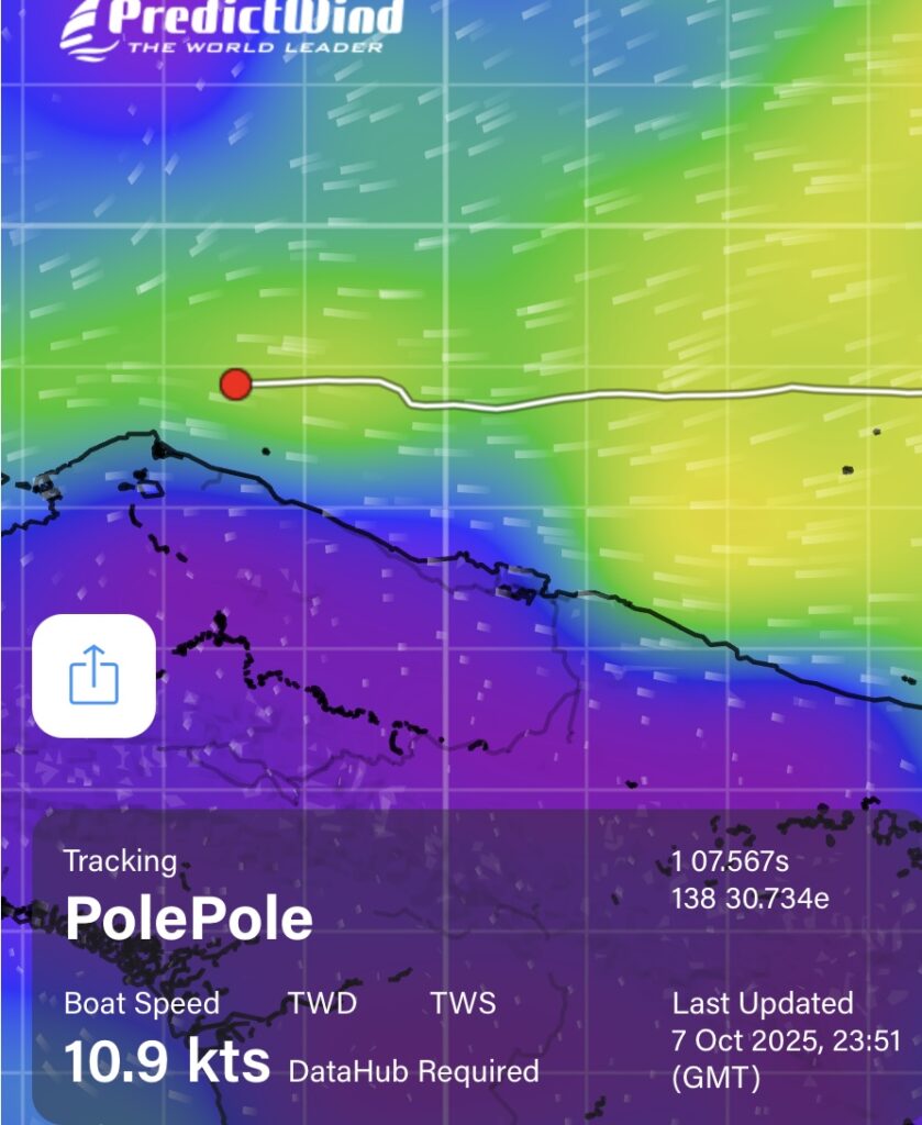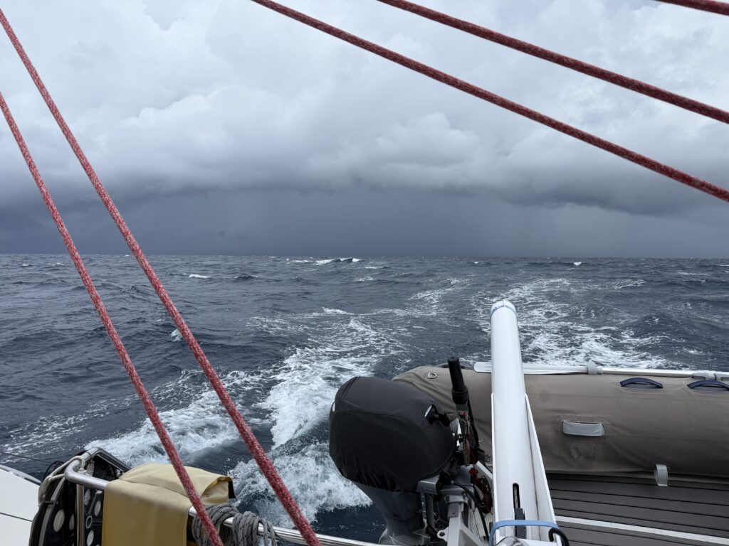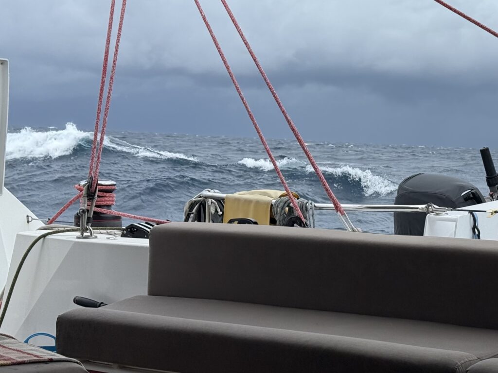 Rowan had an action packed early morning shift with loads of big squalls, pouring rain and loads of scary lightning about, soooo glad it was not on my shift. The winds were in the twenties most of the day which PolePole just loves. A lot of the day we were doing at least 10 knots of boat speed. In the afternoon we put another reef into the main sail and reefed the jib in, as big squalls loomed. We were very pleased we did this as the boat handled all the weather perfectly. The sea got all churned up and the swell became quite choppy, we were really picking up speed down some of the waves. It reminded us of our sail from Suwarrow to Samoa, big seas and wind too. It has been such a change from the gentle winds we’ve had since arriving in Vanuatu in May. I’m humbled thinking of Claudette handling this all on her own in a small boat, but luckily she learnt to sail on the South African coast at Durban, which is one of the toughest. Very tricky sea along that coast, she used to be in a racing team, which is even more gruelling. She has done the whole South African coast endlessly, up to Mozambique and the Seychelles, down to Cape Town many times along the Wild Coast, so she really is a proficient sailor. She checks in every now and then as she does not run her Starlink all the time as it chews up so much power. She sounds absolutely fine, going slowly, which is sensible with her dodgy shroud and rudder!